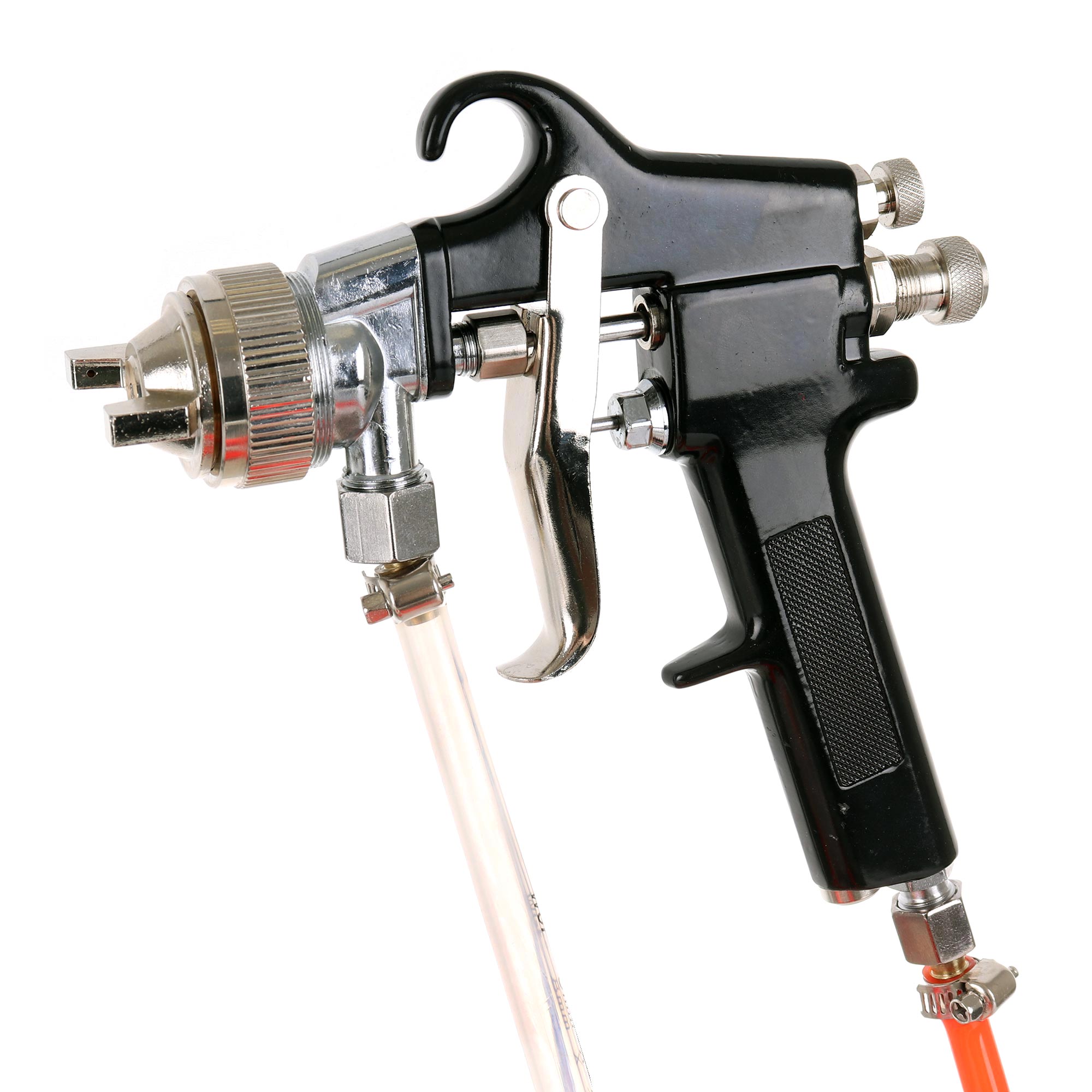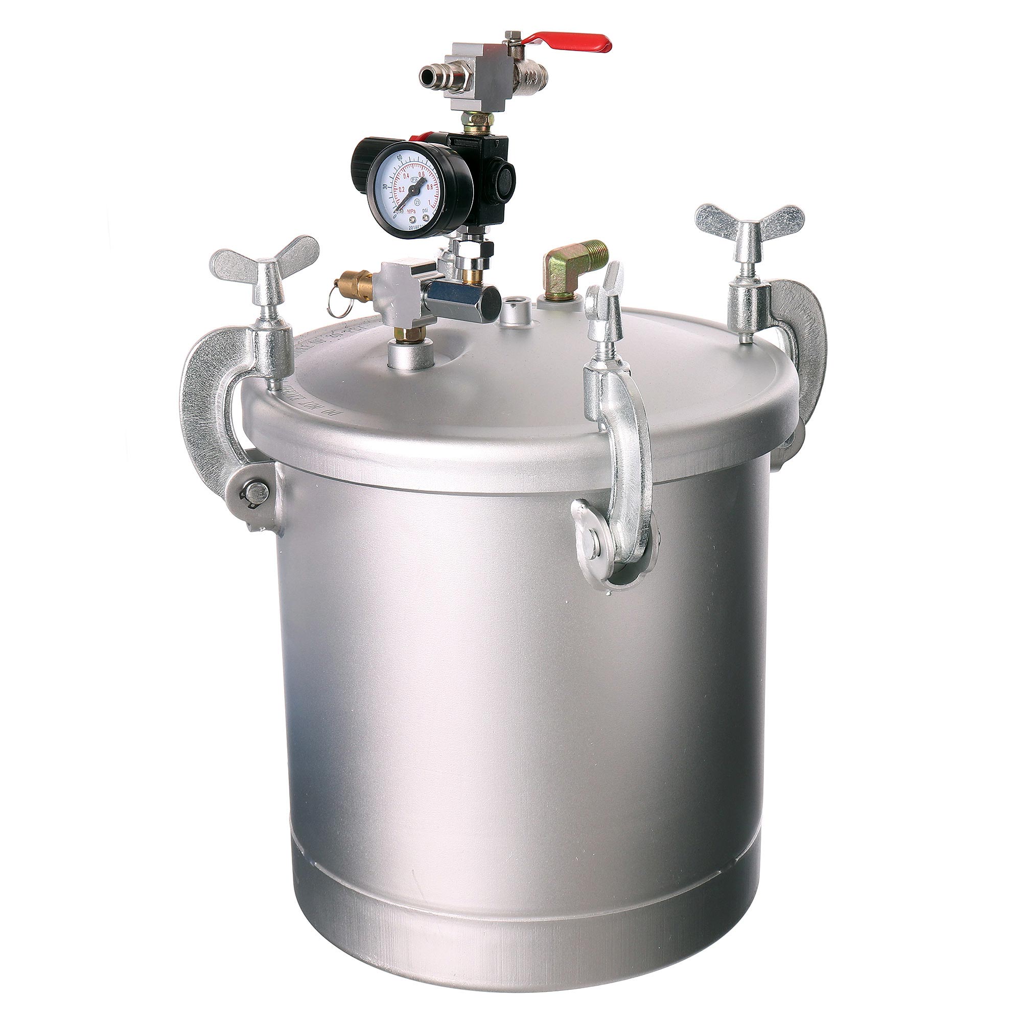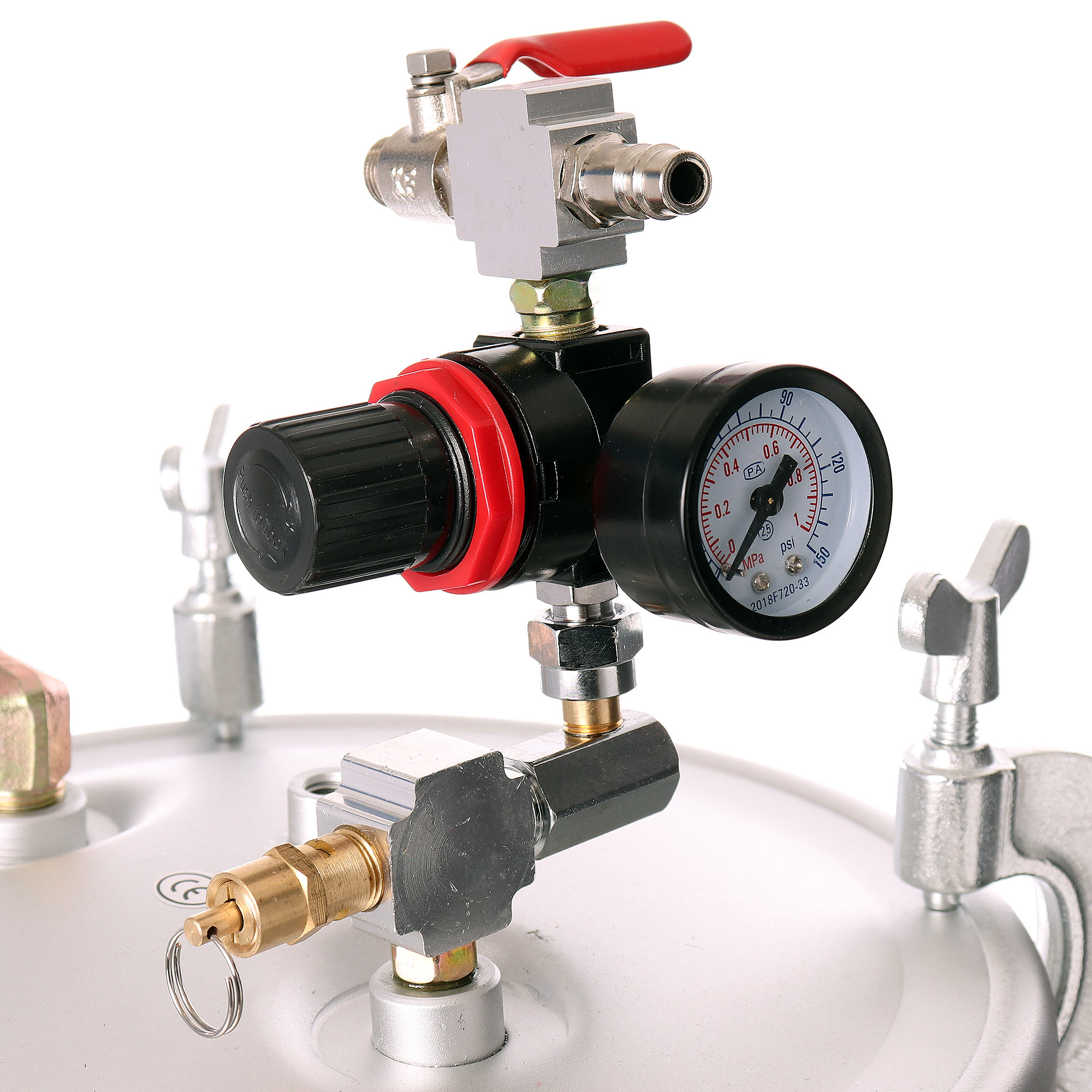 Das Lackiergerät ist mit einer Hochdruck-Lackierpistole mit 1,8-mm-Düse, einem 10-Liter-Druckbehälter, einem Druckregler mit Manometer und einem Sicherheitsventil ausgestattet.