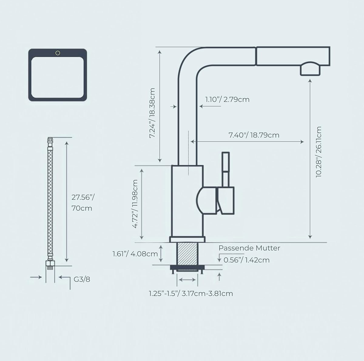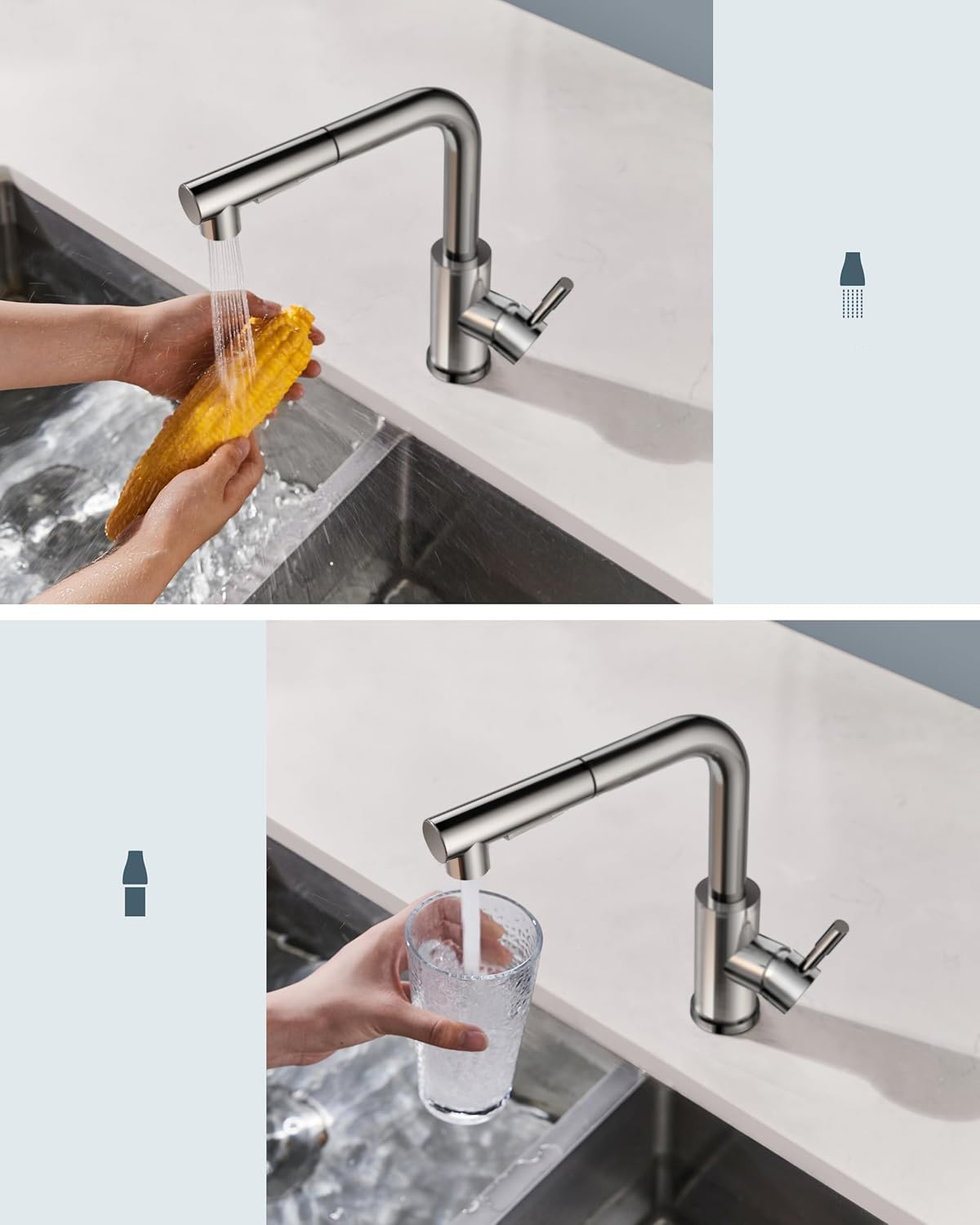 Duża przestrzeń: bateria w kształcie cyfry 7, wysokość kranu 27 cm, w porównaniu do zwykłych kranów zapewnia o 80% więcej przestrzeni. Niezależnie od wielkości naczynia, można je łatwo umieścić, co sprawia, że zlew kuchenny jest mniej zatłoczony.