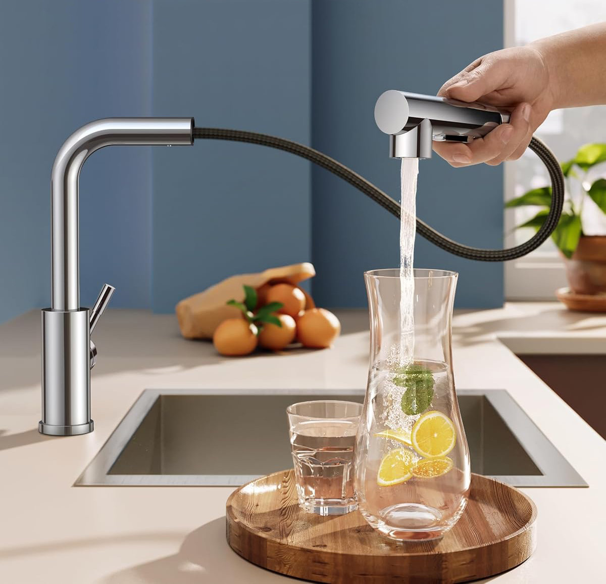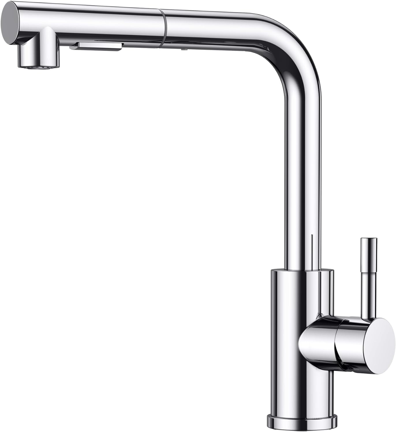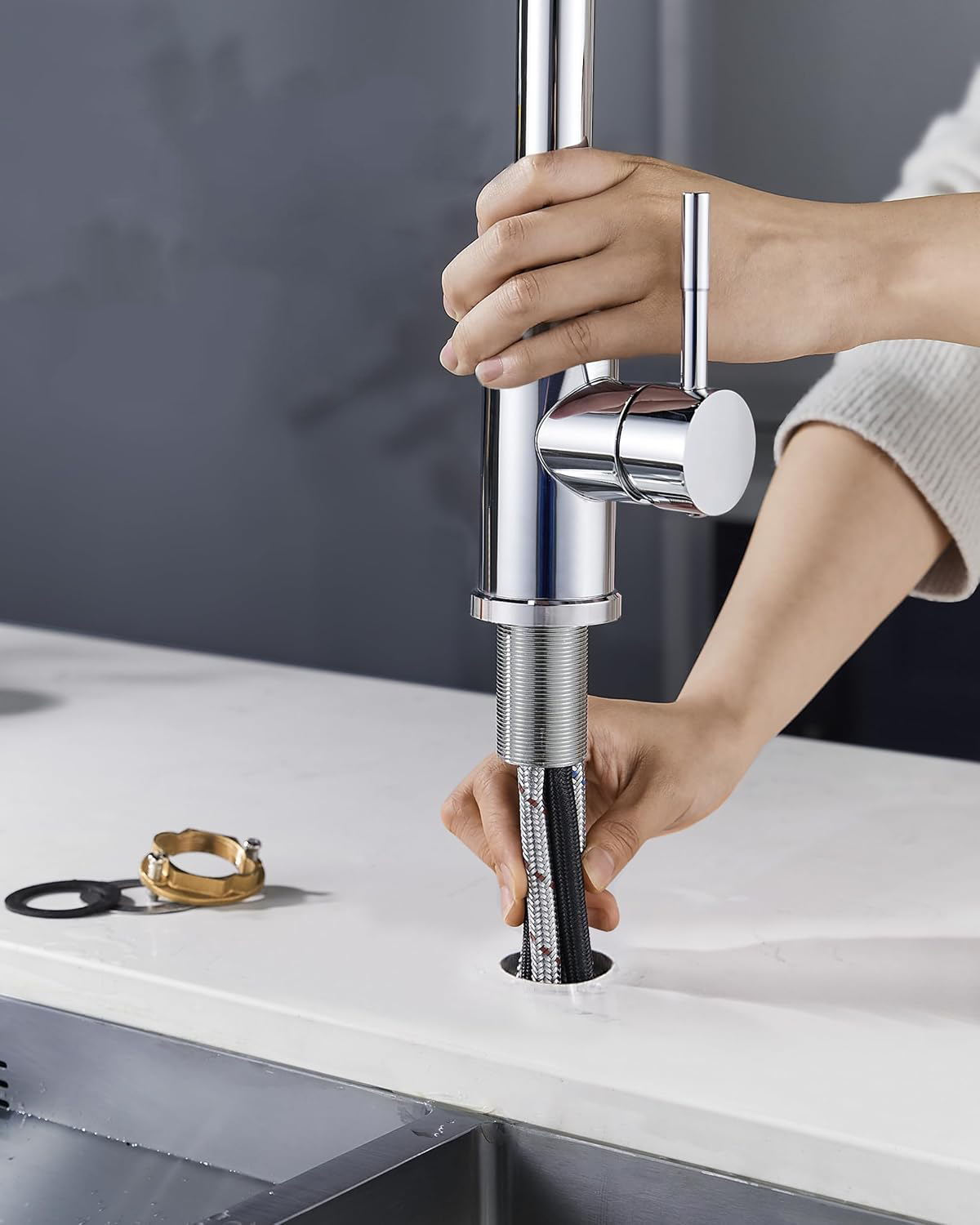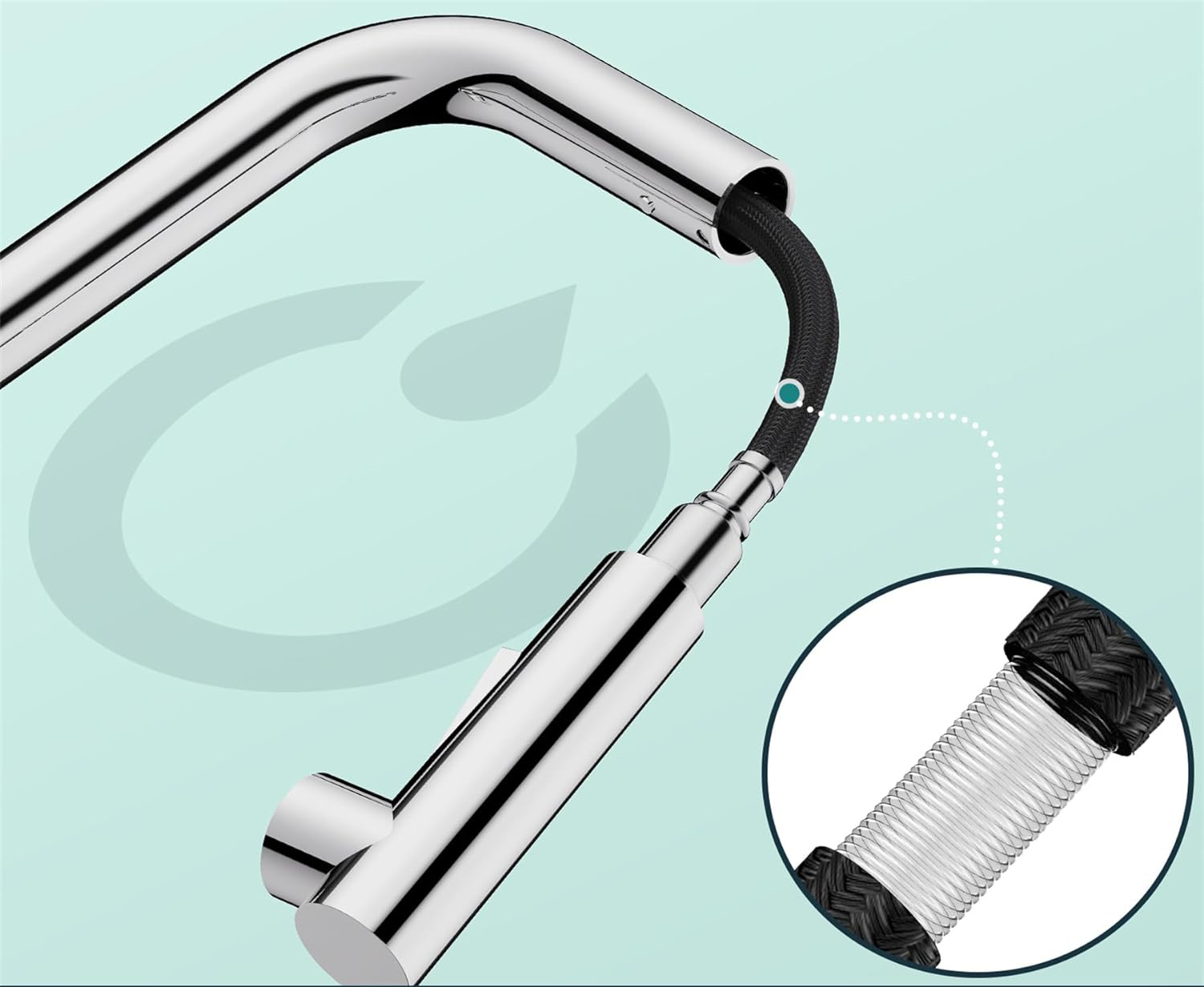 Elastyczny design wyciągany: łatwo zwijalny elastyczny wąż z obrotowym adapterem zapewnia rozszerzony zakres ruchu z możliwością zginania, obracania i sięgania wokół zlewu, a także wygodę głowicy natryskowej, która całkowicie i bezpiecznie wraca na swoje miejsce.