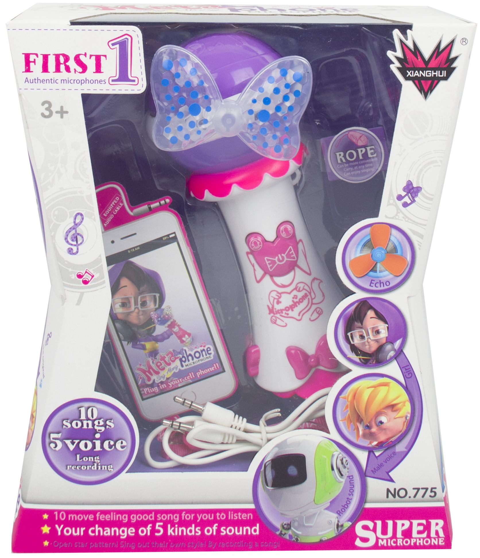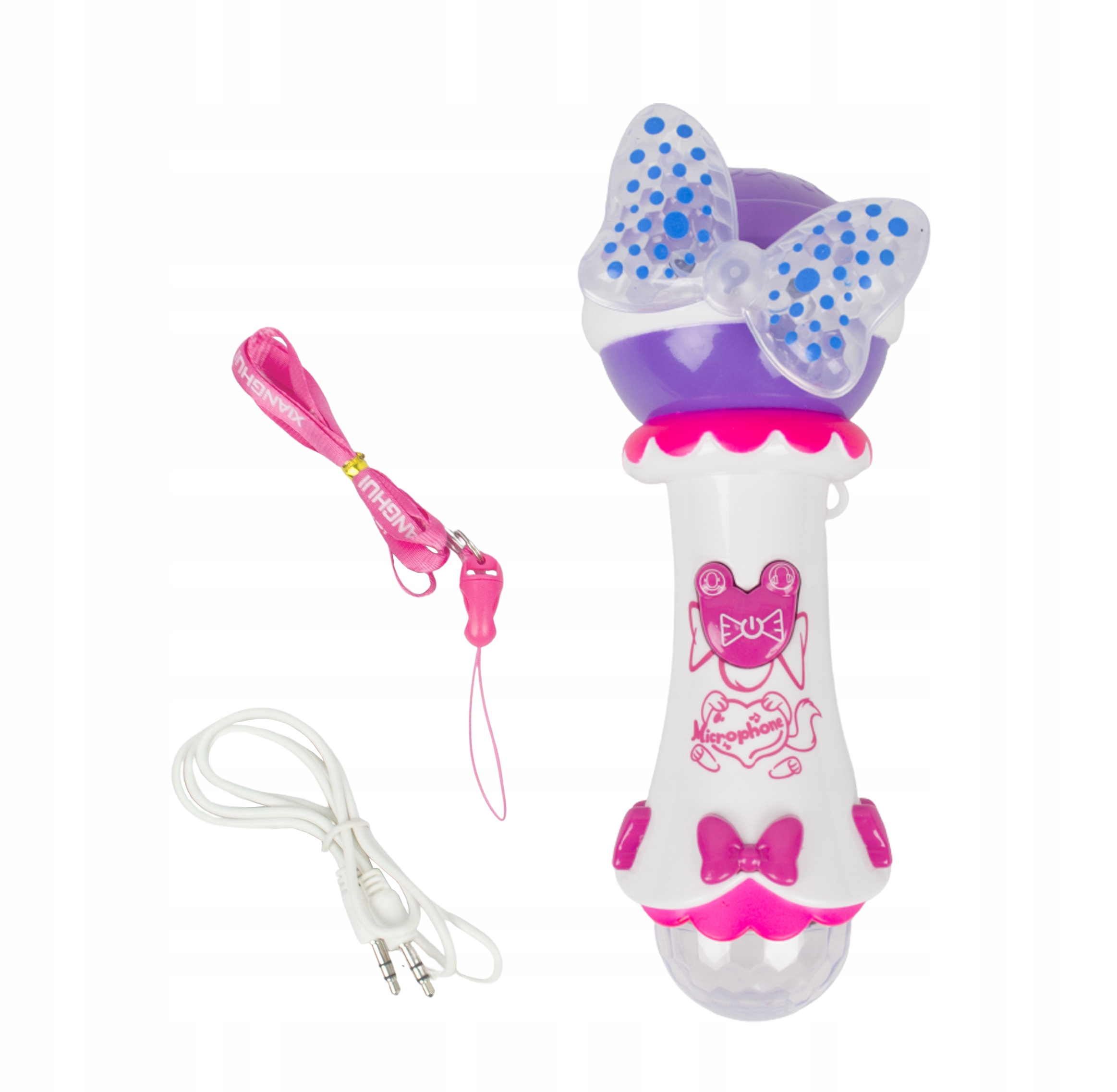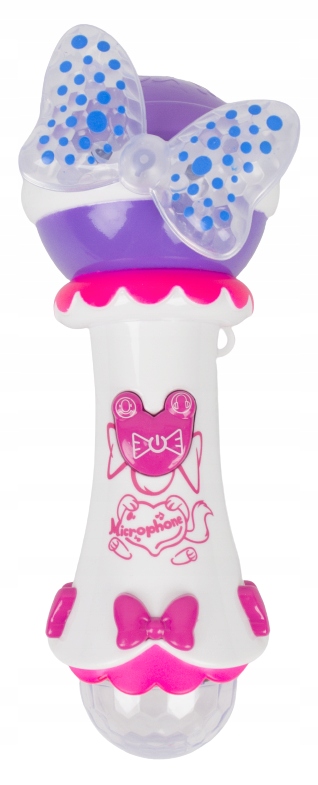Mikrofon posiada aż 10 wgranych piosenek, do których można śpiewać, tańczyć i się bawić. Są to popularne, znane wśród najmłodszych przeboje. Zabawka ma czuły mikrofon z redukcją szumów. Można jednocześnie odtwarzać piosenkę i śpiewać, gdyż głos będzie również wychwytywany przez mikrofon. Piosenki przełącza się środkowym przyciskiem z narysowaną kokardką. Po naciśnięciu kombinacji przycisków – lewy, a następnie prawy uruchamia się modyfikacja głosu. Można wybrać jedną z pięciu opcji: oryginalny głos, męski głos, damski głos, echo i dźwięk robota.