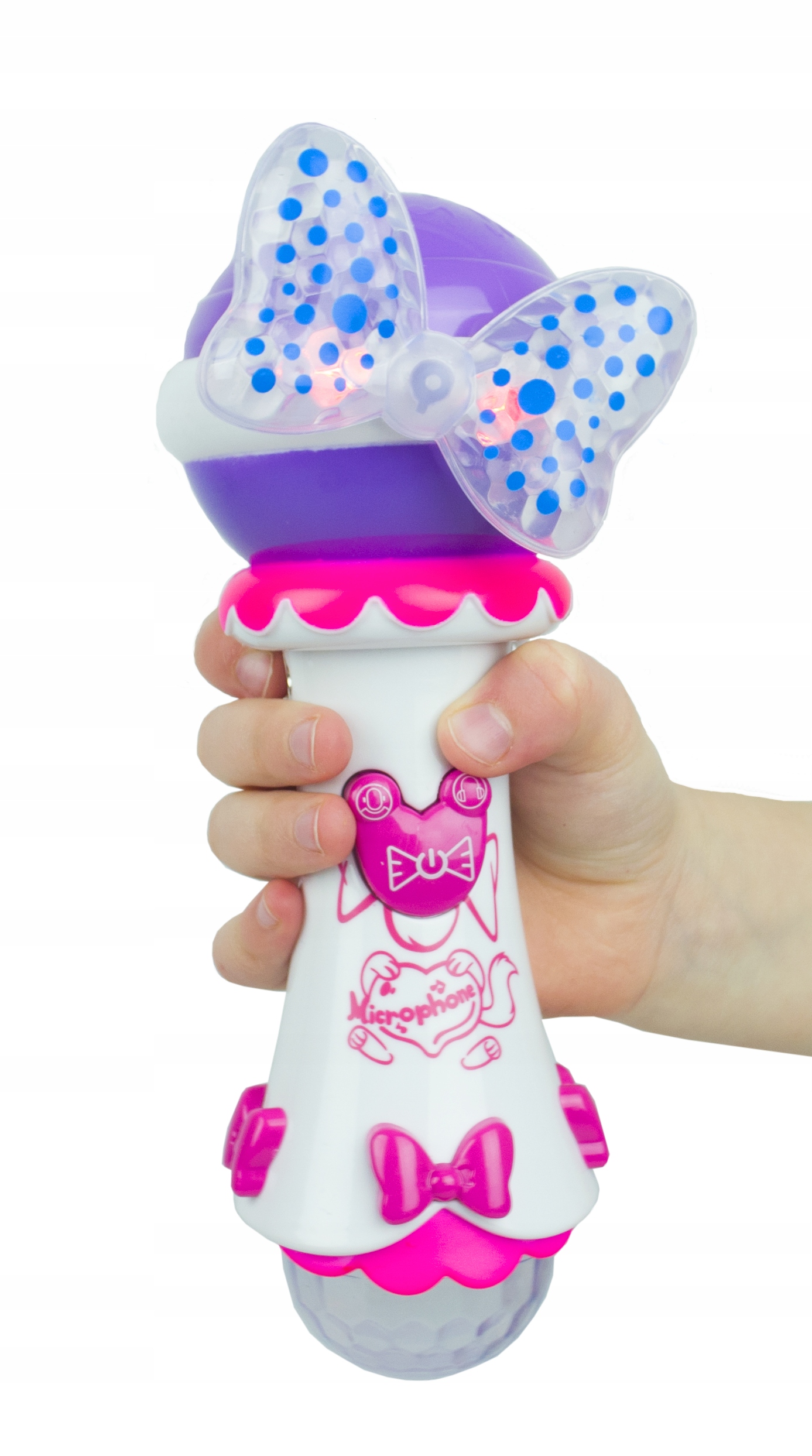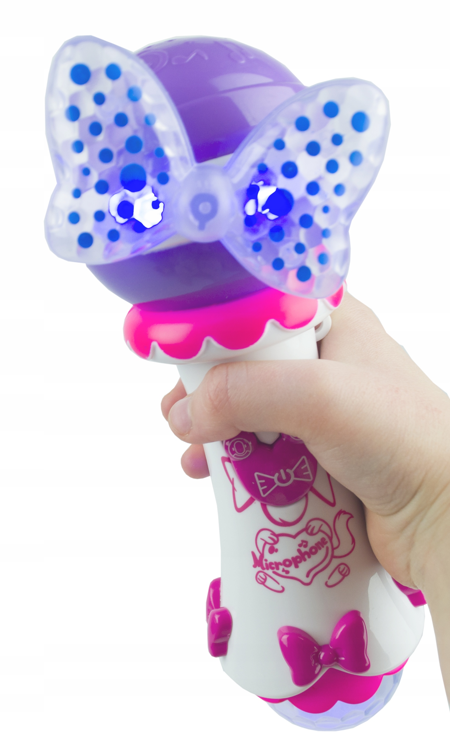 Podczas zabawy mikrofon emituje kolorowe światła. Migająca kokarda oraz kula umieszczona na spodzie zabawki oddają styl estradowego oświetlenia. To sprawia, że zabawa jest jeszcze przyjemniejsza. Przy wyłączonym świetle – zabawka łudząco przypomina dyskotekowe stroboskopy.