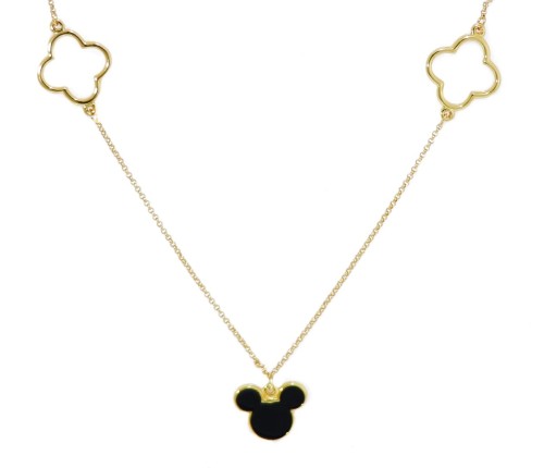 Naszyjnik z kolekcji Myszka. Niezwykle efektowny naszyjnik z trzema Myszkami. Dwie delikatne Myszki po bokach o wymiatach 2 cm x 2 cm, jedna malowana na czarno o wymiarach 2 cm x 1 cm. Naszyjnik idealny na prezent. Długość 46cm Producent Colibra …