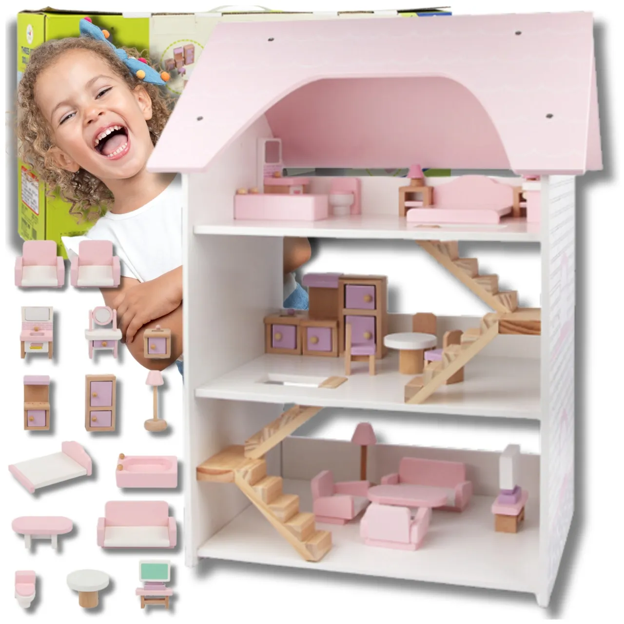 DUŻY DREWNIANY DOMEK DLA LALEK 3 PIĘTRA +MEBLE
