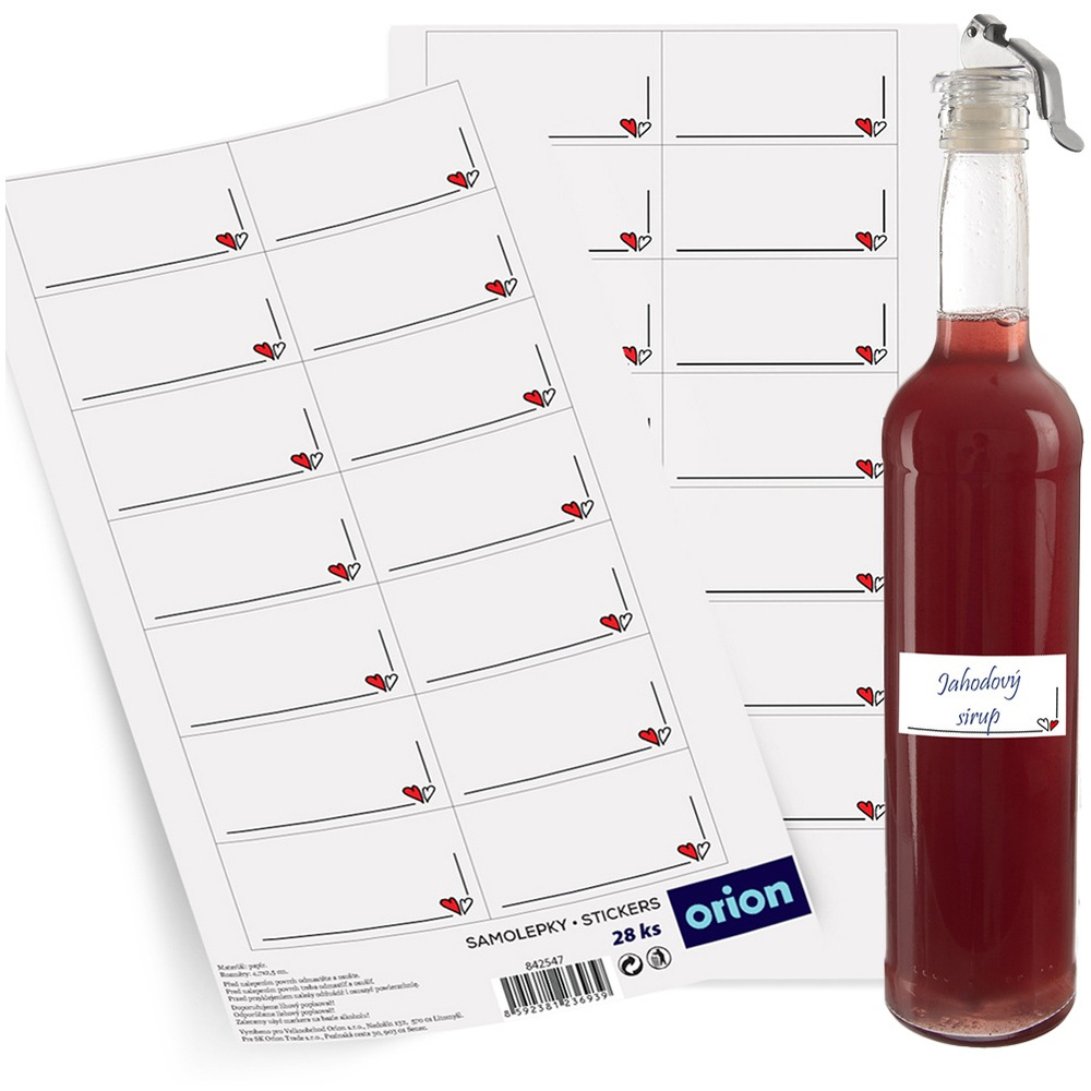 Zestaw 28 szt. etykiet samoprzylepnych. Naklejki świetnie sprawdzą się do podpisywania słoików, butelek, ale również pojemników z przyprawami oraz szafek i prezentów. Pomogą utrzymać porządek w domowej spiżarni. Dzięki nim podpisane słoiki, pojemniki prezentują się bardzo elegancko i mogą stanowić element dekoracyjny. Oryginalny produkt czeskiej marki Orion. Wyprodukowano zgodnie z europejskimi standardami.