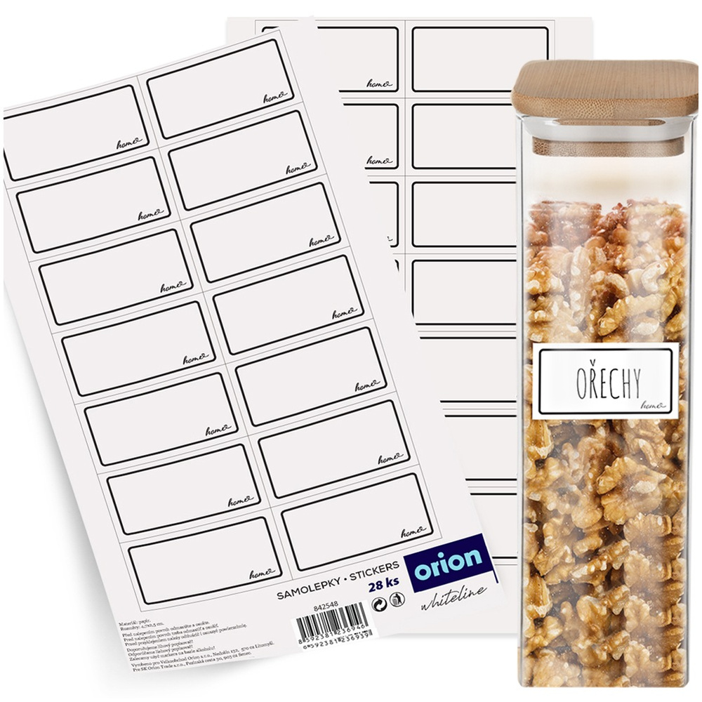 Zestaw 28 szt. etykiet samoprzylepnych. Naklejki świetnie sprawdzą się do podpisywania słoików, butelek, ale również pojemników z przyprawami oraz szafek i prezentów. Pomogą utrzymać porządek w domowej spiżarni. Dzięki nim podpisane słoiki, pojemniki prezentują się bardzo elegancko i mogą stanowić element dekoracyjny. Oryginalny produkt czeskiej marki Orion. Wyprodukowano zgodnie z europejskimi standardami.