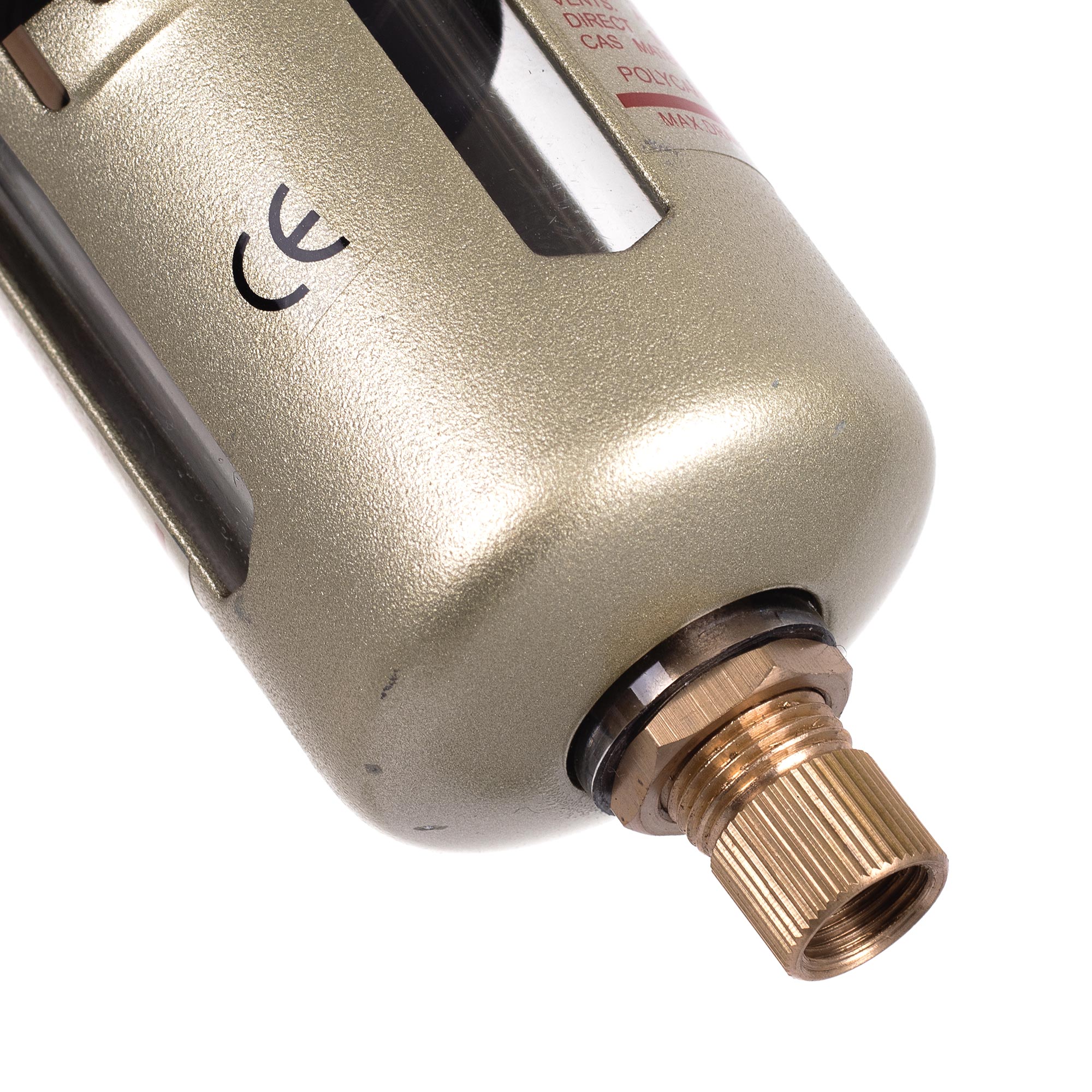 Filtr nie wymaga dodatkowych mocowań, utrzymuje się na nyplu lub złączce, którą będzie przymocowany do kompresora. Opróżnianie wody polega na wciśnięciu zaworu umieszczonego u dołu filtra. Separuje on również olej i inne zanieczyszczenia. Wyposażony jest w metalową osłonę zbiornika.