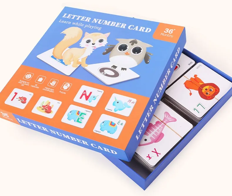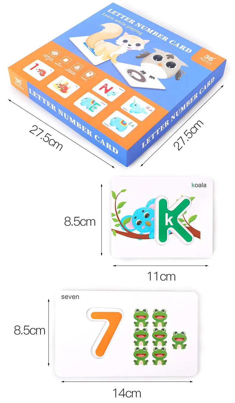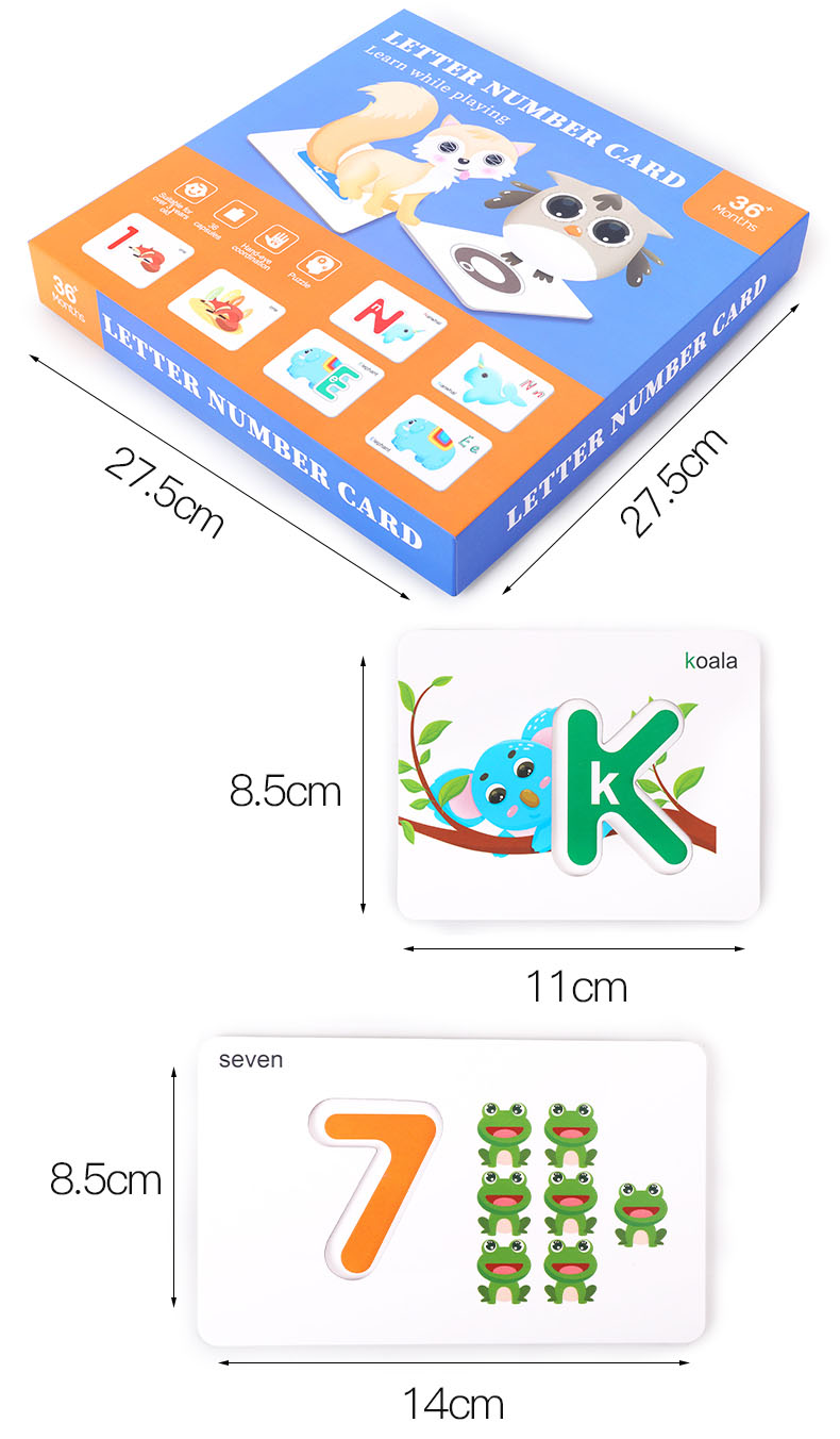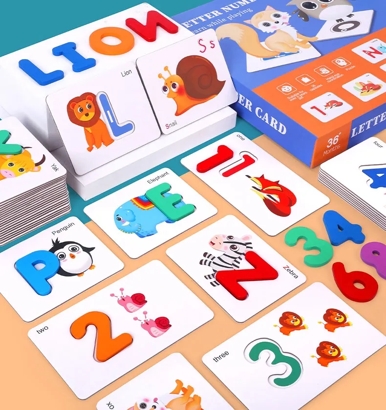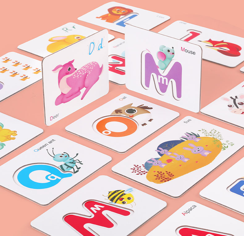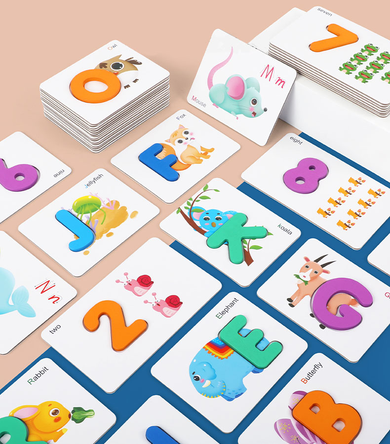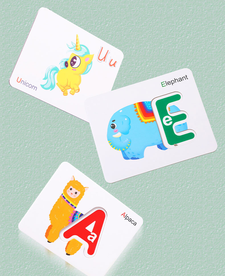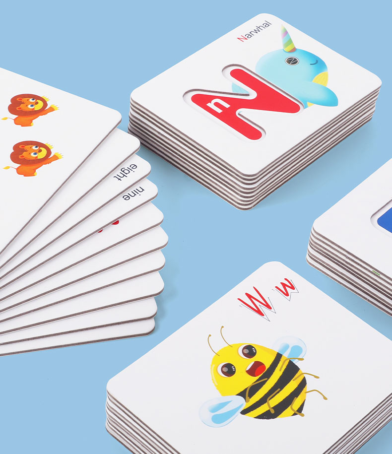 Przy pomocy kolorowych kart, możemy nauczyć dziecko alfabetu i cyfr, w późniejszym etapie dzięki kojarzeniu dziecko w szybki sposób zapamięta nazwy zwierzątek.