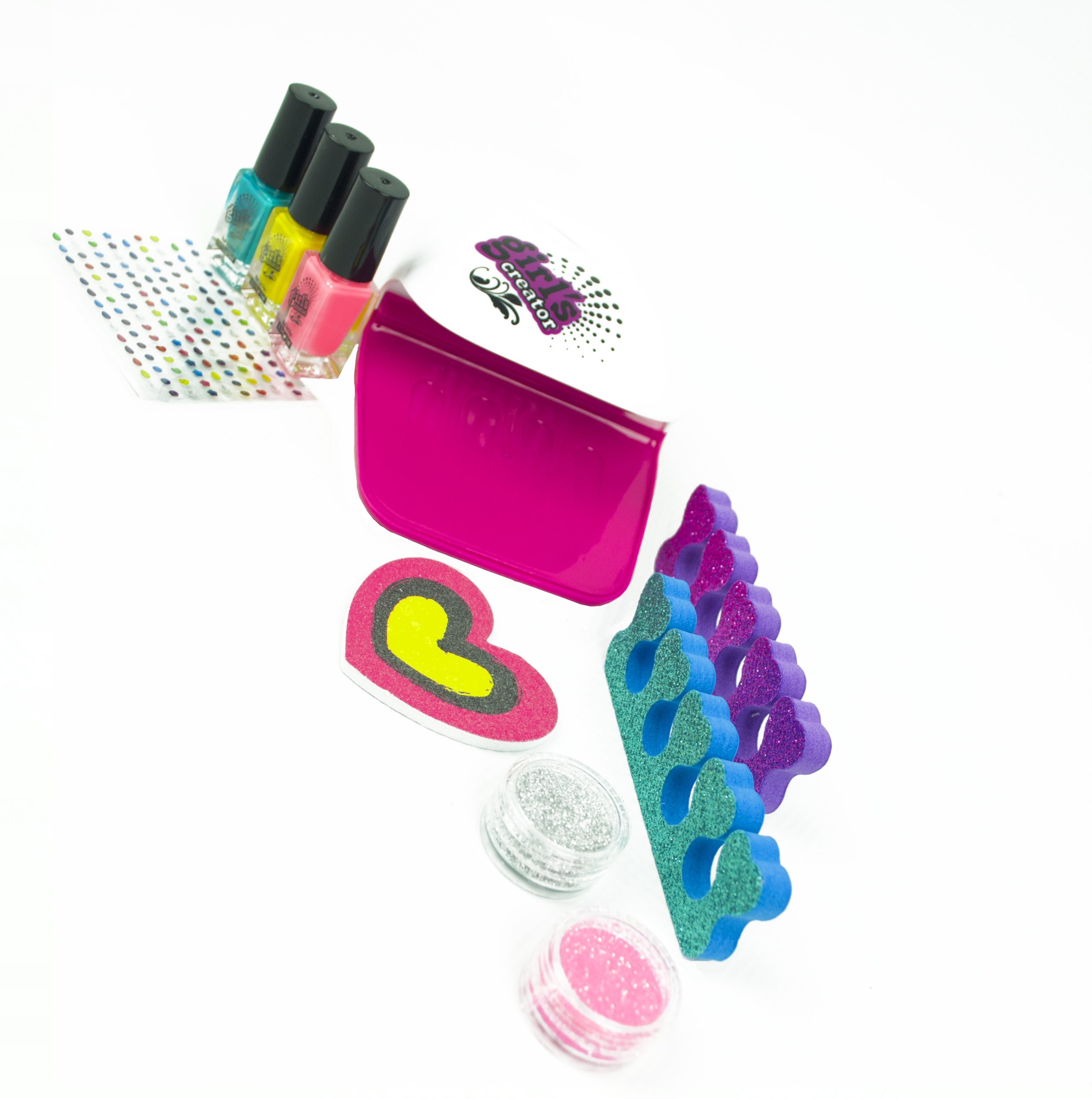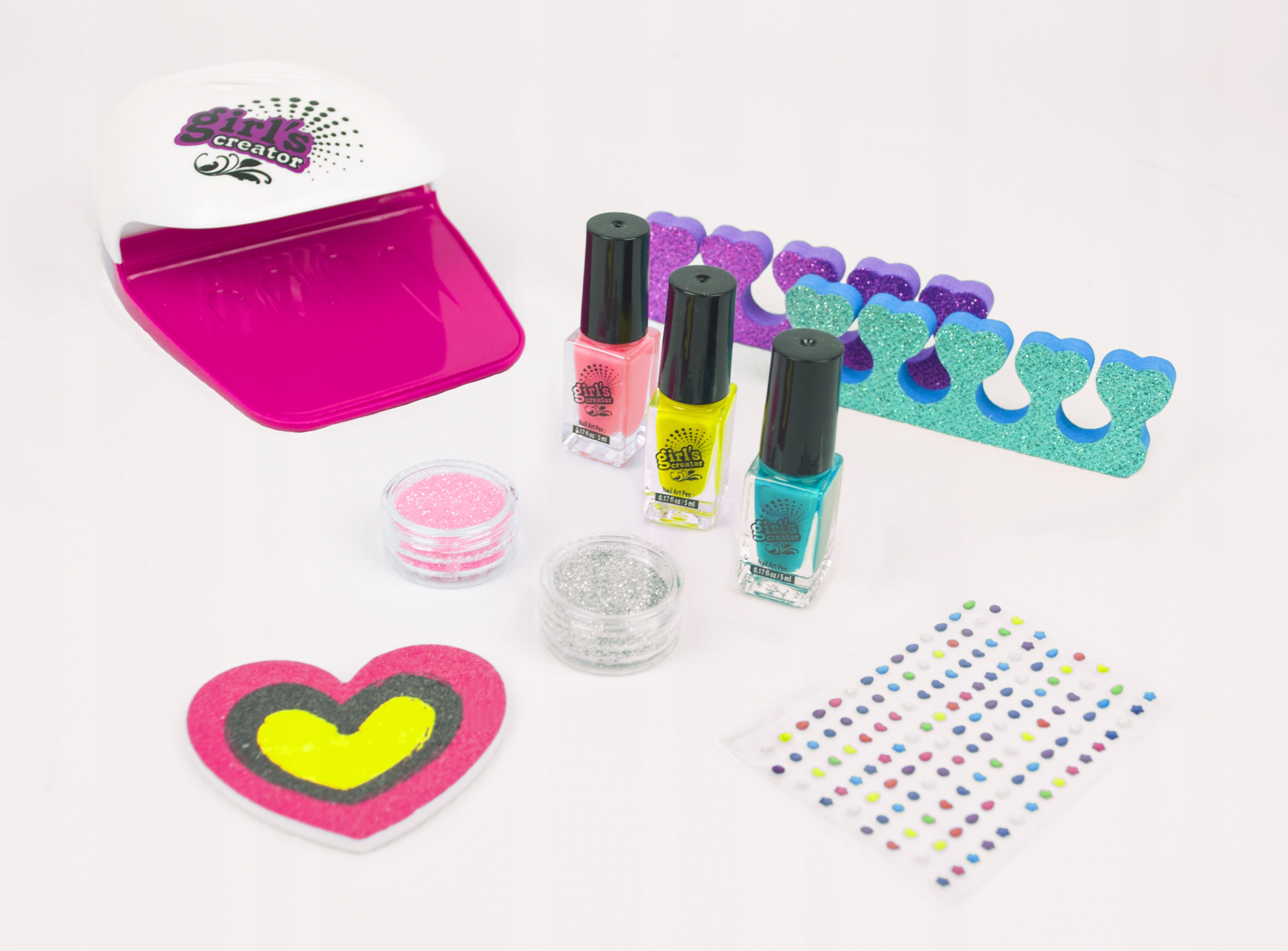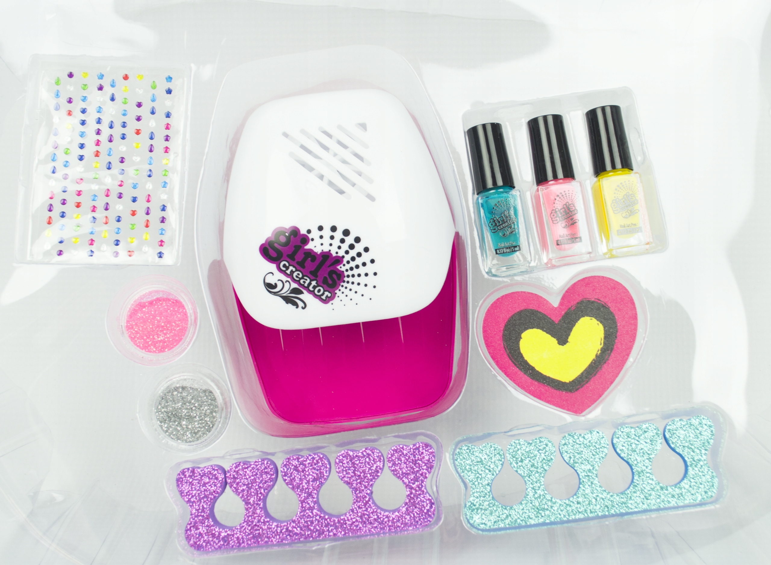 W zestawie znajdują się niezbędne akcesoria do przygotowania wyjątkowej stylizacji paznokci. Są to separatory suszarka, pilnik, lakiery, brokaty i naklejki. Dzięki nim dziewczynka będzie miała okazję zapoznać się z całym procesem malowania paznokci od podstaw.