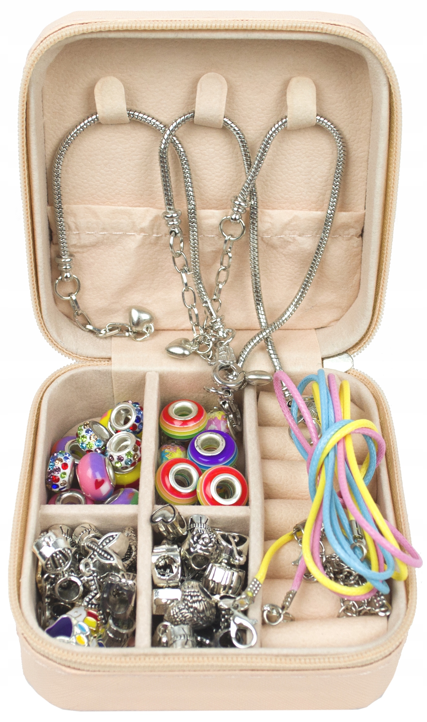 Zestaw posiada skupiające uwagę kolory i kształty. W efektownym kuferku znajdują się 3 bransoletki, 3 kolorowe naszyjniki/bransoletki, 20 koralików, 20 charmsów z dziurką, 20 charmsów z zawieszką. Koraliki są starannie wykończone, posiadają łagodne krawędzie, a łańcuszki można łatwo dopasować w otwory. Elementy zostały wykonane z najwyższej jakości materiałów. O tym wszystkim zapewniają też certyfikaty bezpieczeństwa CE i EN71.