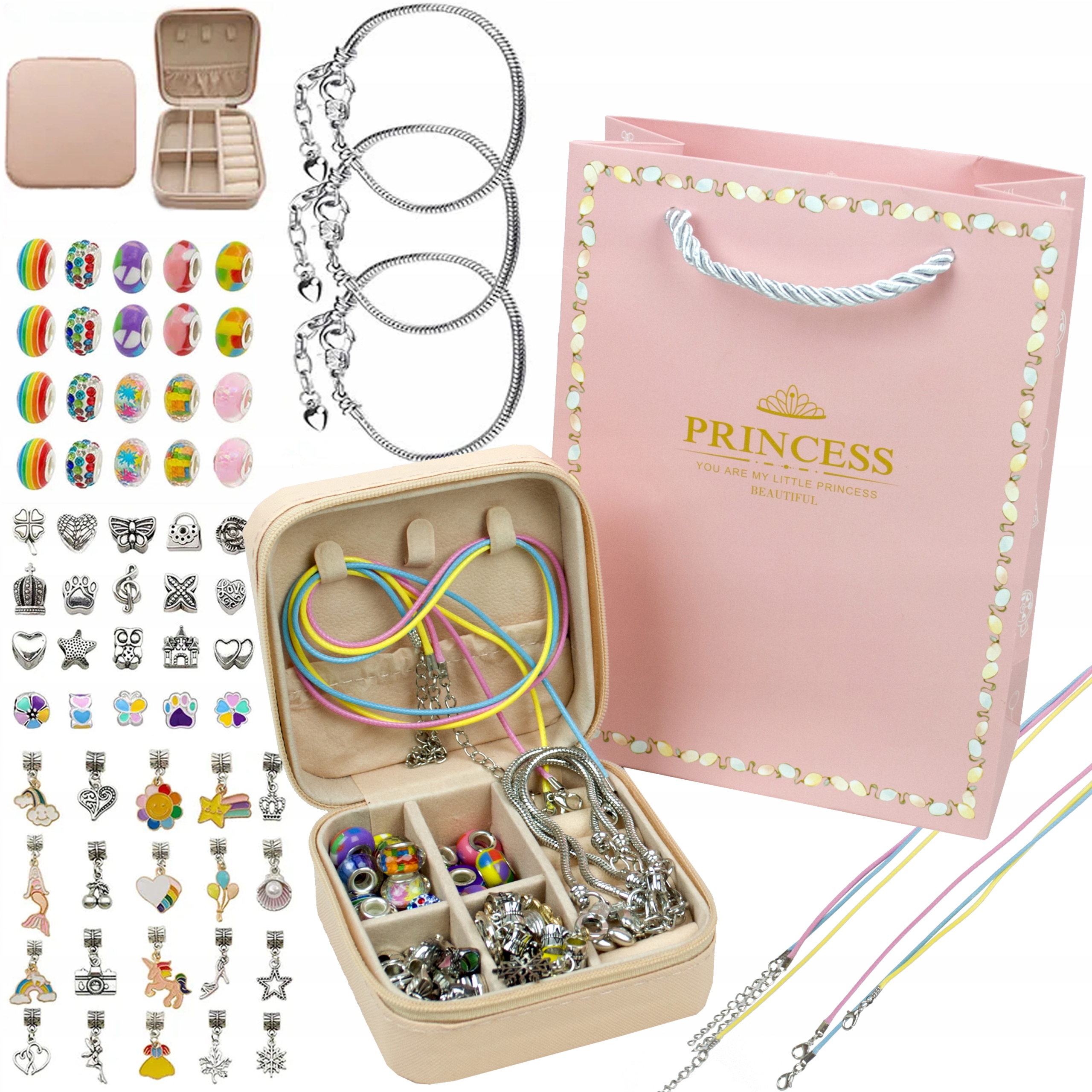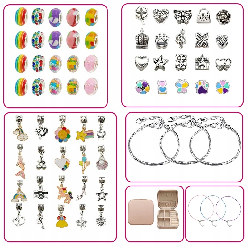 Zestaw zawiera wszystko do stworzenia stylowych, oryginalnych i fantazyjnych bransoletek oraz naszyjników. Niech poniesie nas wyobraźnia! Dzięki tak dużej ilości elementów można przez swoje rękodzieło wyrazić siebie, akcentując bransoletki ulubionymi dodatkami, np. torebka, psia łapka, syrenka czy klucz wiolinowy. Wybór jest naprawdę duży i z pewnością każdy znajdzie coś dla siebie.