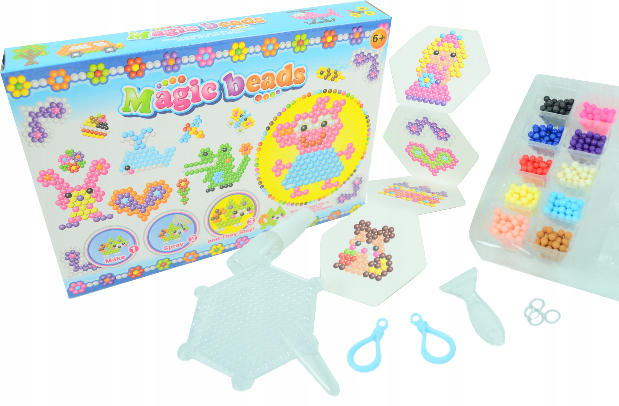 Zestaw magicznych koralików pozwoli Twojemu dziecku stworzyć wyjątkowe, niepowtarzalne projekty obrazków, które po utrwaleniu wodą pozostaną utrwalone na stałe! Aby wykonać tego typu obrazek, wystarczy ułożyć koraliki w konkretny wzór (wymyślony przez siebie lub z pomocą załączonych gotowych szablonów), a następnie spryskać je wodą z aplikatora. To zabawa nie tylko dla młodszych, ale i starszych dzieci! Jest to zestaw, który rozwija wyobraźnię i kreatywność oraz doskonali zdolności manualne.