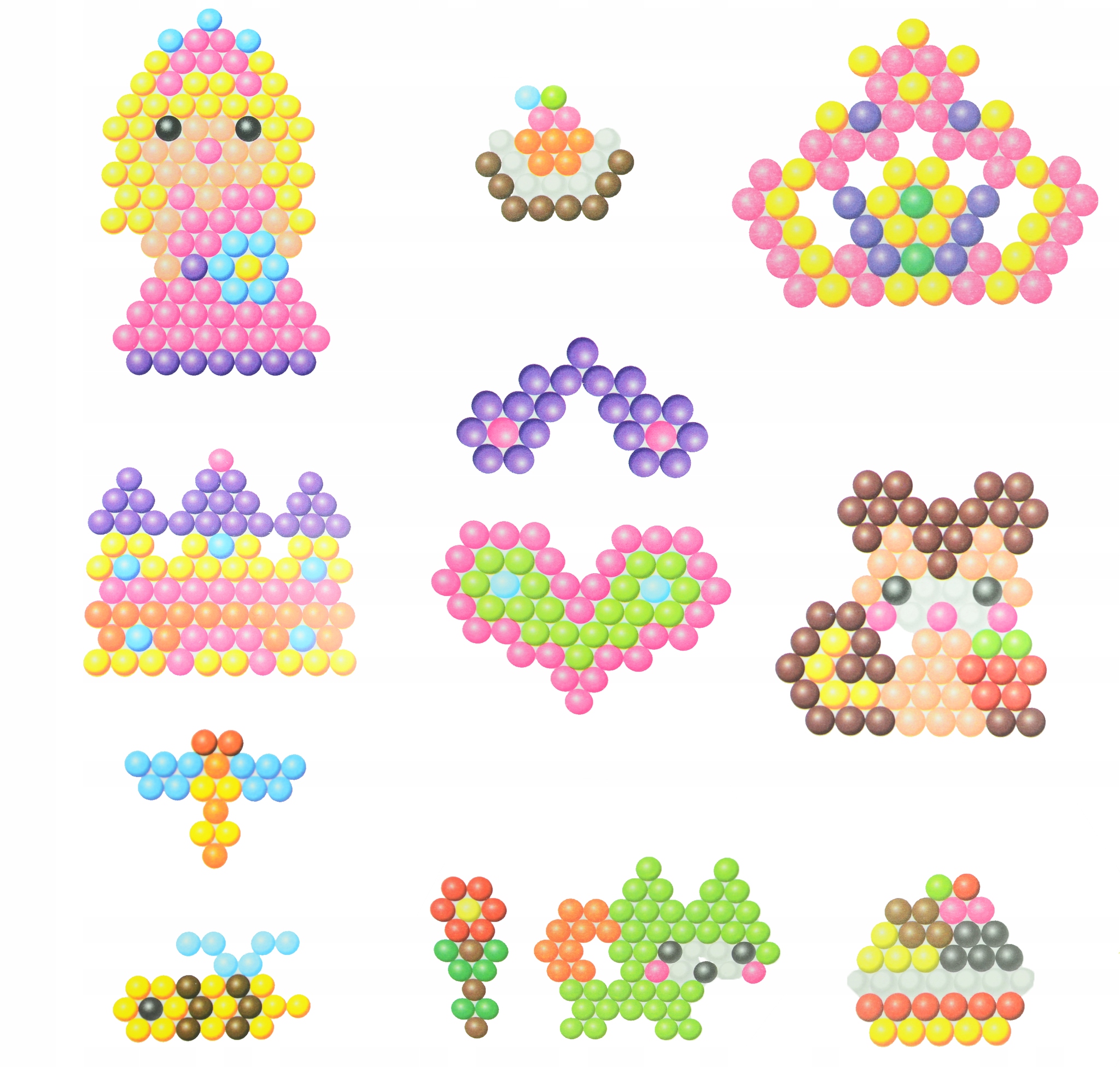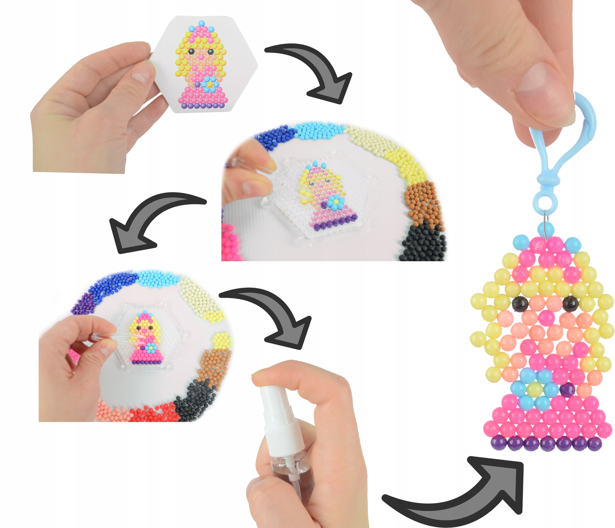 Wystarczy ułożyć kuleczki w odpowiednich miejscach tworząc wesołe kształty - po czym spryskać je wodą, aby koraliki w magiczny sposób trwale się ze sobą skleiły. Możesz używać szablonów dołączonych do zestawu lub kreować swoje własne wzory.