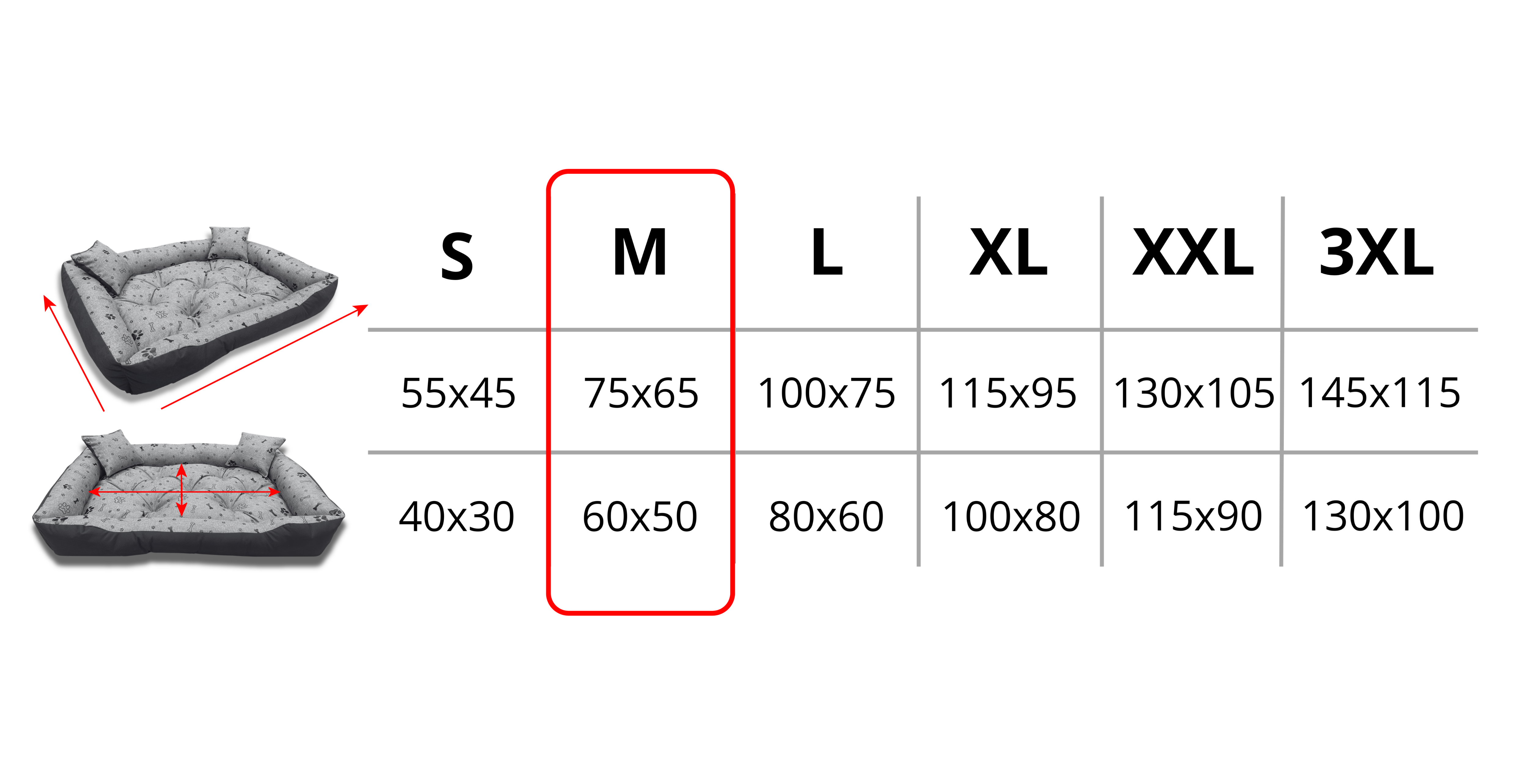 W naszej ofercie znajdziesz kilka rozmiarów legowiska PRESTIGE KOŚCI CZARNE. Dzięki temu z powodzeniem dobierzesz model pasujący do Twojego pupila. Zaobserwuj w jaki sposób Twój zwierzak najchętniej odpoczywa i śpi. Jeżeli uwielbia wtulać się w ranty legowiska to potrzebuje ciaśniejszego legowiska, a jeżeli z zamiłowania śpi na środku jak król to zdecydowanie potrzebuje więcej miejsca :)