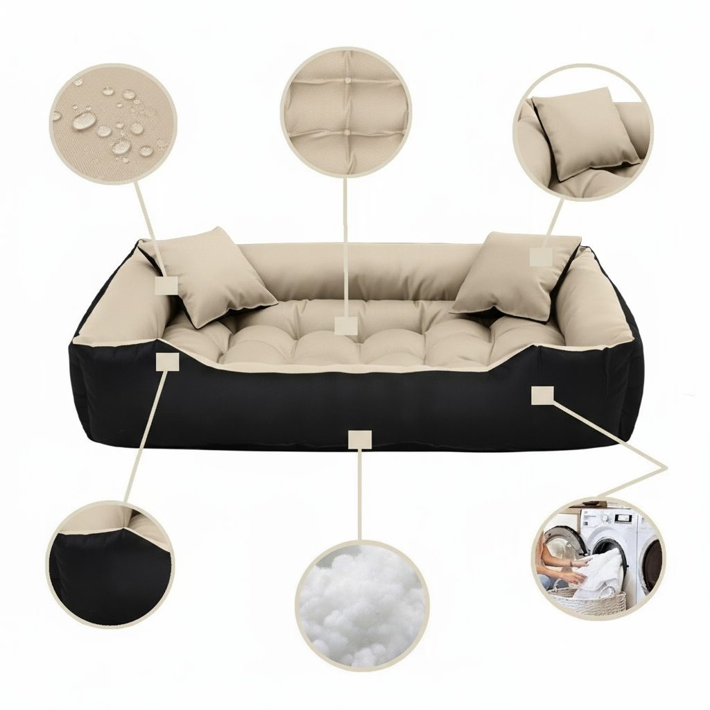 Wytrzymałe WODOODPORNE legowisko dla psa. Gwarantujemy, że legowisko nie tylko spodoba się Tobie, ale przede wszystkim Twojemu zwierzakowi. Materiały użyte do jego produkcji są solidne, praktyczne i co najważniejsze wytrzymałe. Jest to wyjątkowe i bardzo klasyczne legowisko z dwiema małymi poduszkami. Zapewniamy, że Twój pupil będzie cieszył się wyjątkowym miejscem do spania i odpoczynku!