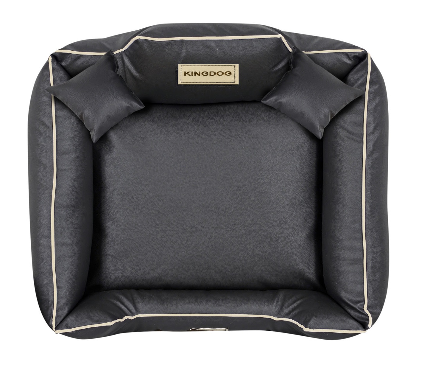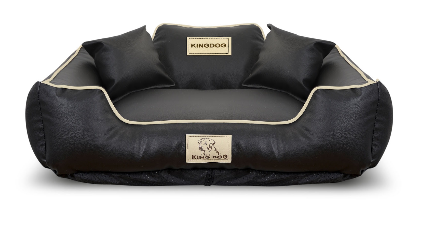Wykonane z ECOSKÓRY, ROZBIERALNE z zamkiem, antypoślizgowe legowisko dla psa KINGDOG w kolorze czarnym z białą lamówką, PERSONALIZOWANE imieniem pupila!