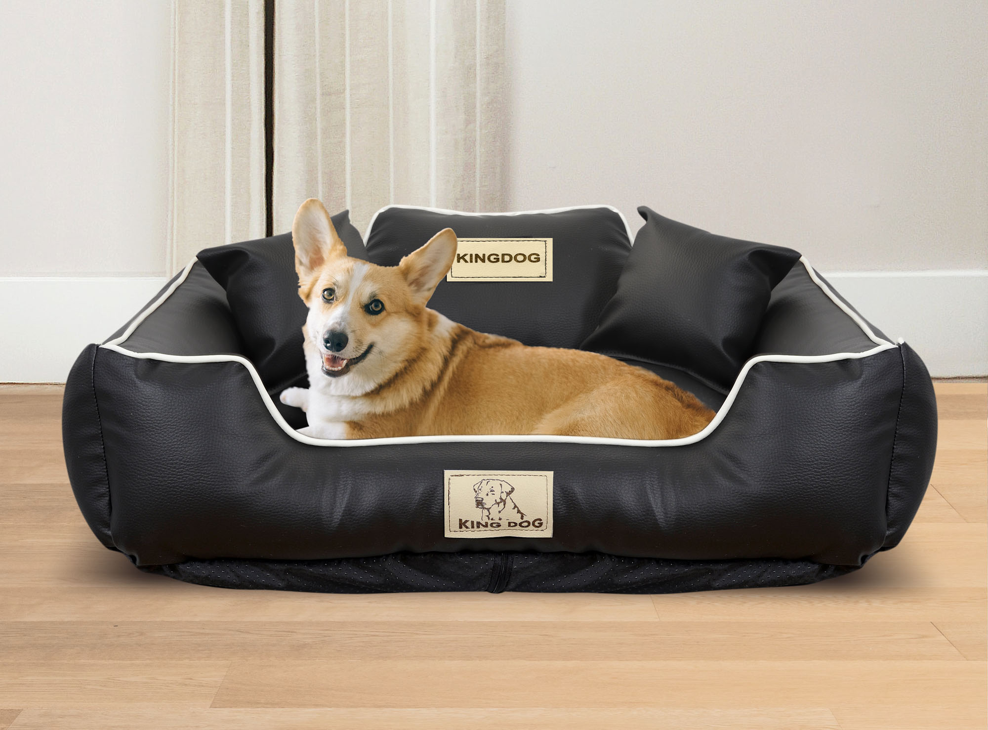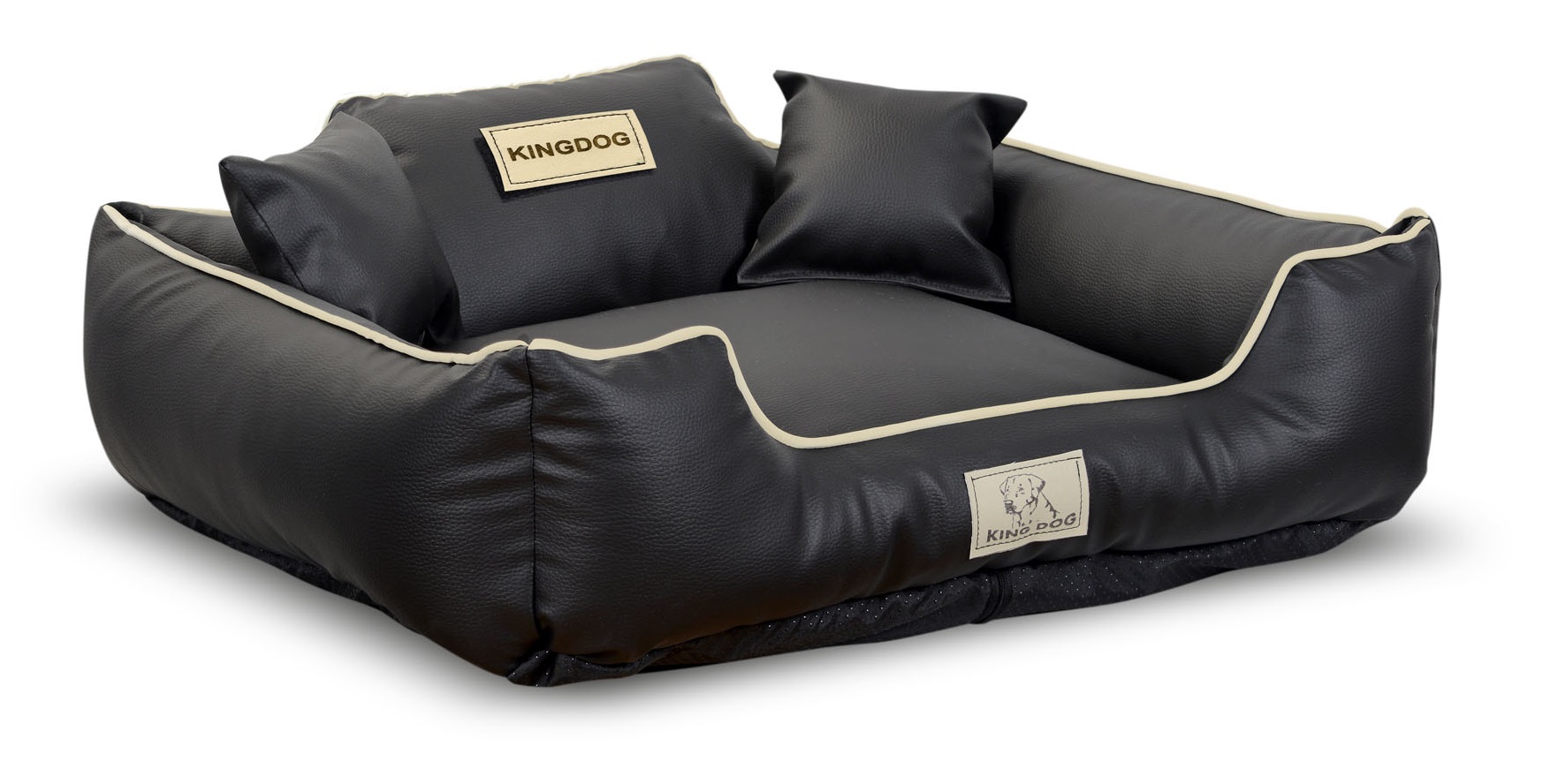 Wykonane z ECOSKÓRY, ROZBIERALNE z zamkiem, antypoślizgowe legowisko dla psa KINGDOG w kolorze czarnym z białą lamówką, PERSONALIZOWANE imieniem pupila!
