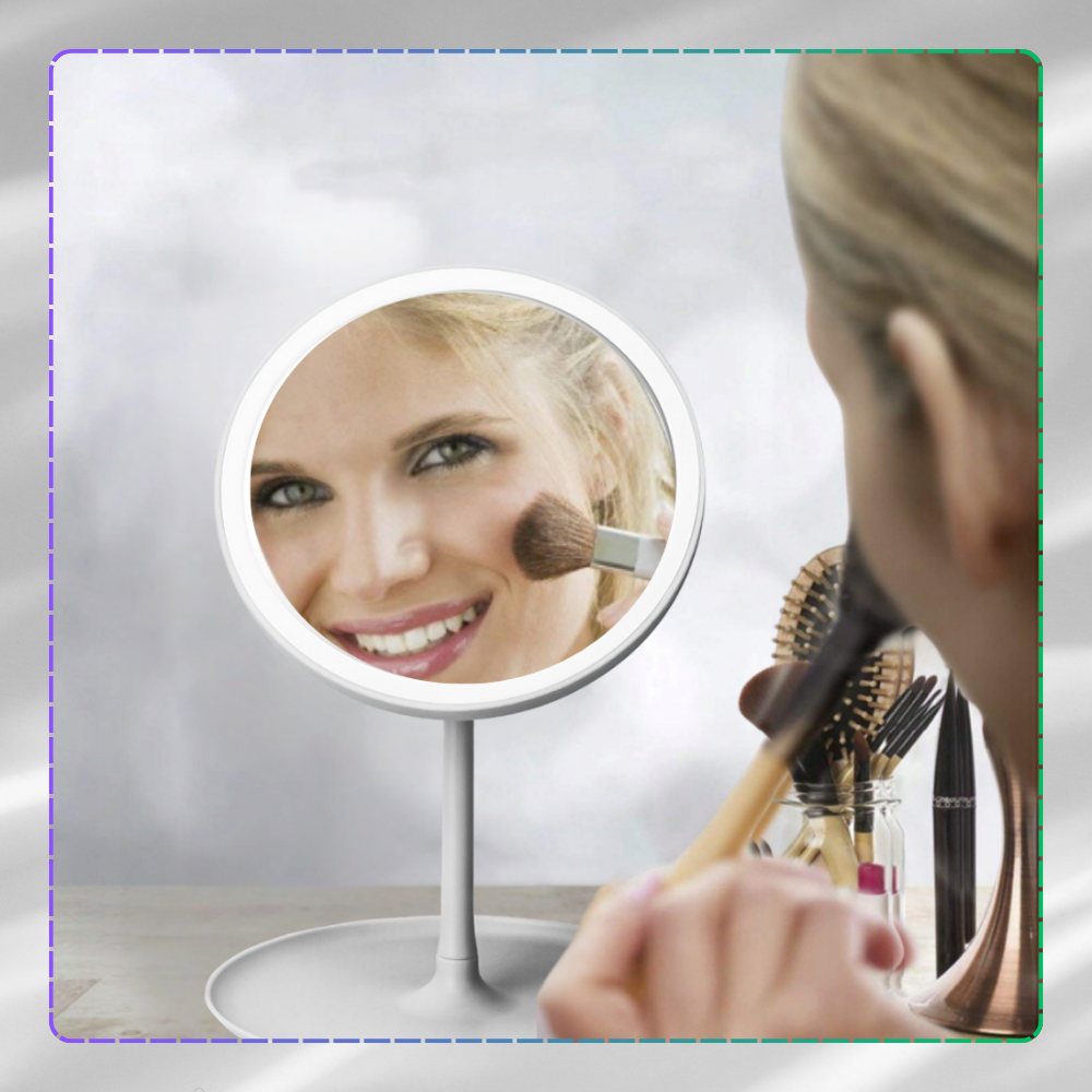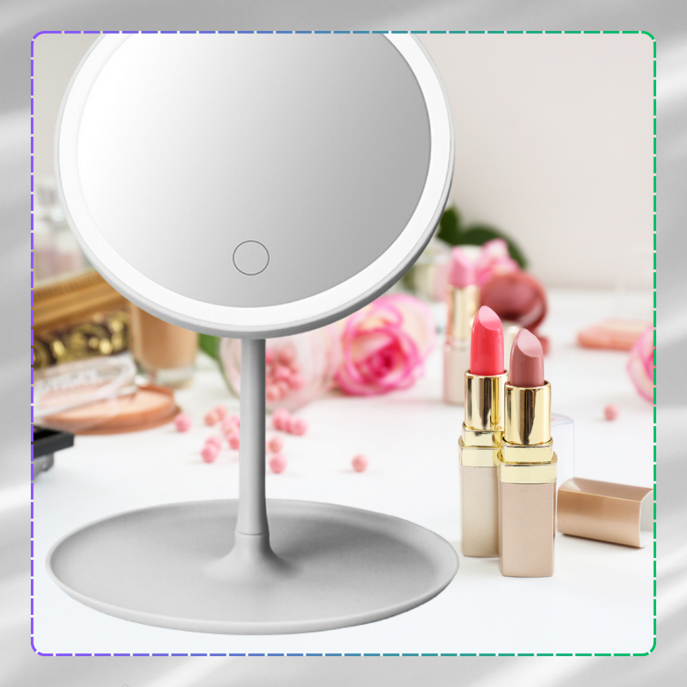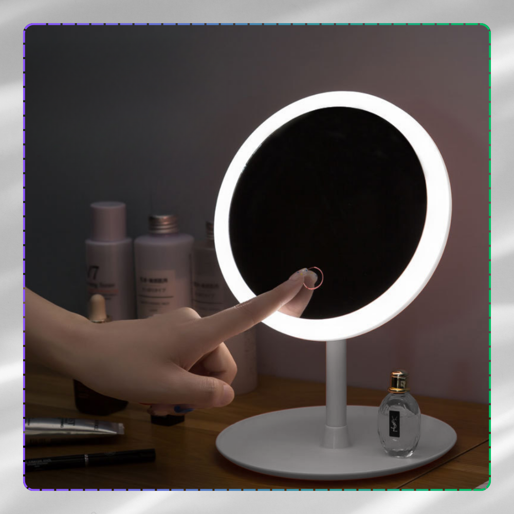 Wokół lustra zamontowane zostało oświetlenie ledowe, dzięki czemu możemy dokładnie zobaczyć swoje odbicie. Oświetlenie zapala się za pomocą przycisku umiejscowionego na lusterku. Posiada trzy stopnie światła barwa zimna, ciepła i neutralna. Podstawa lusterka jest lekko wgłębiona dzięki temu możemy ustawić tam swoje kosmetyki.