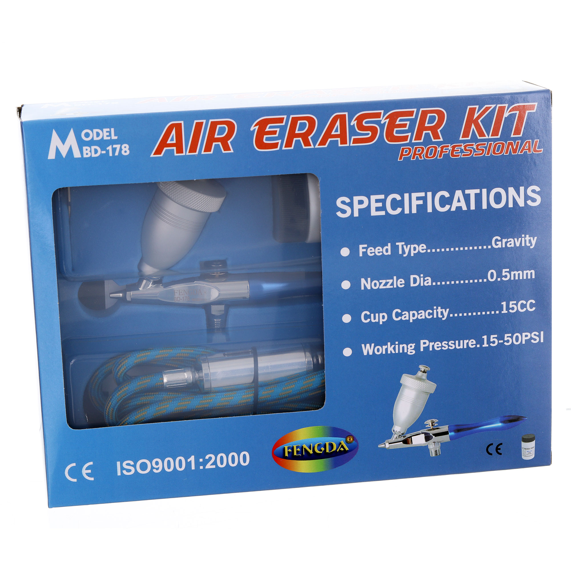 The round-pattern nozzle (0.5mm) of this tool sprays abrasive powder for a variety of uses; etching glass, plastic, metal or other materials, cleaning paint, discolorations, corrosion and rust from jewelry or other small items, erasing defects from artwork, and adding weathering effects to models, as well as many other applications.