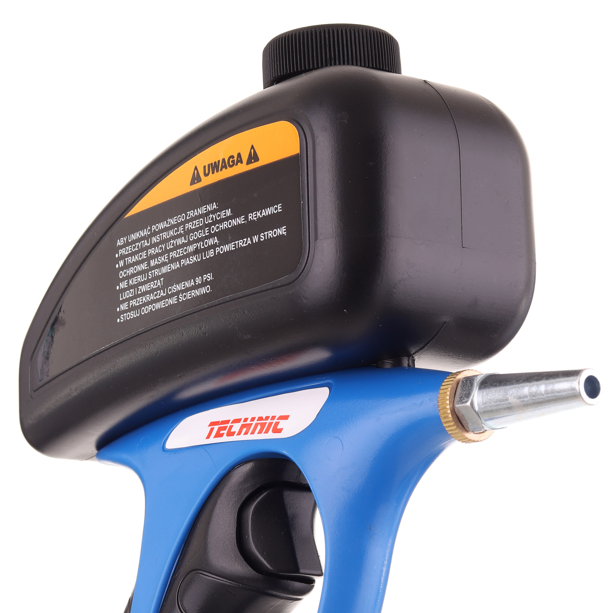 Dzięki górnemu zbiornikowi piasek sam zsypuje się, oszczędzamy w ten sposób część powietrza zasilającego. Pistolet ten może więc współpracować z niedużymi kompresorami.