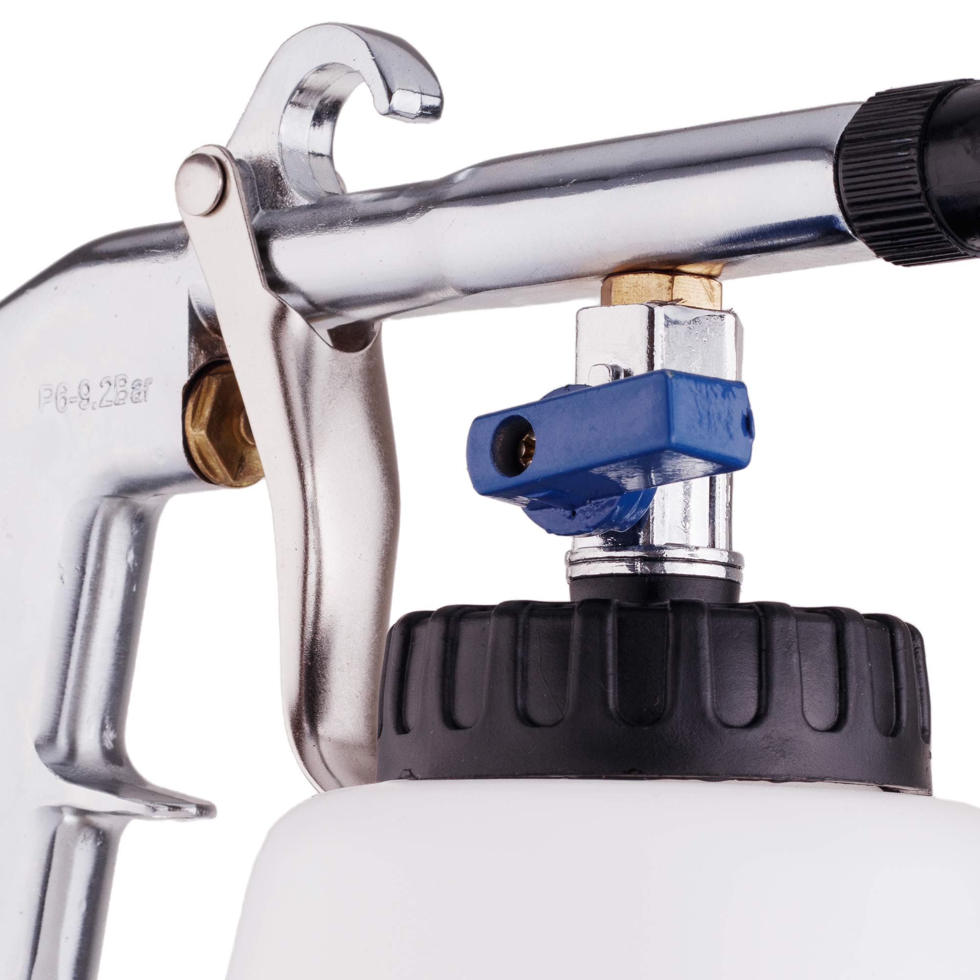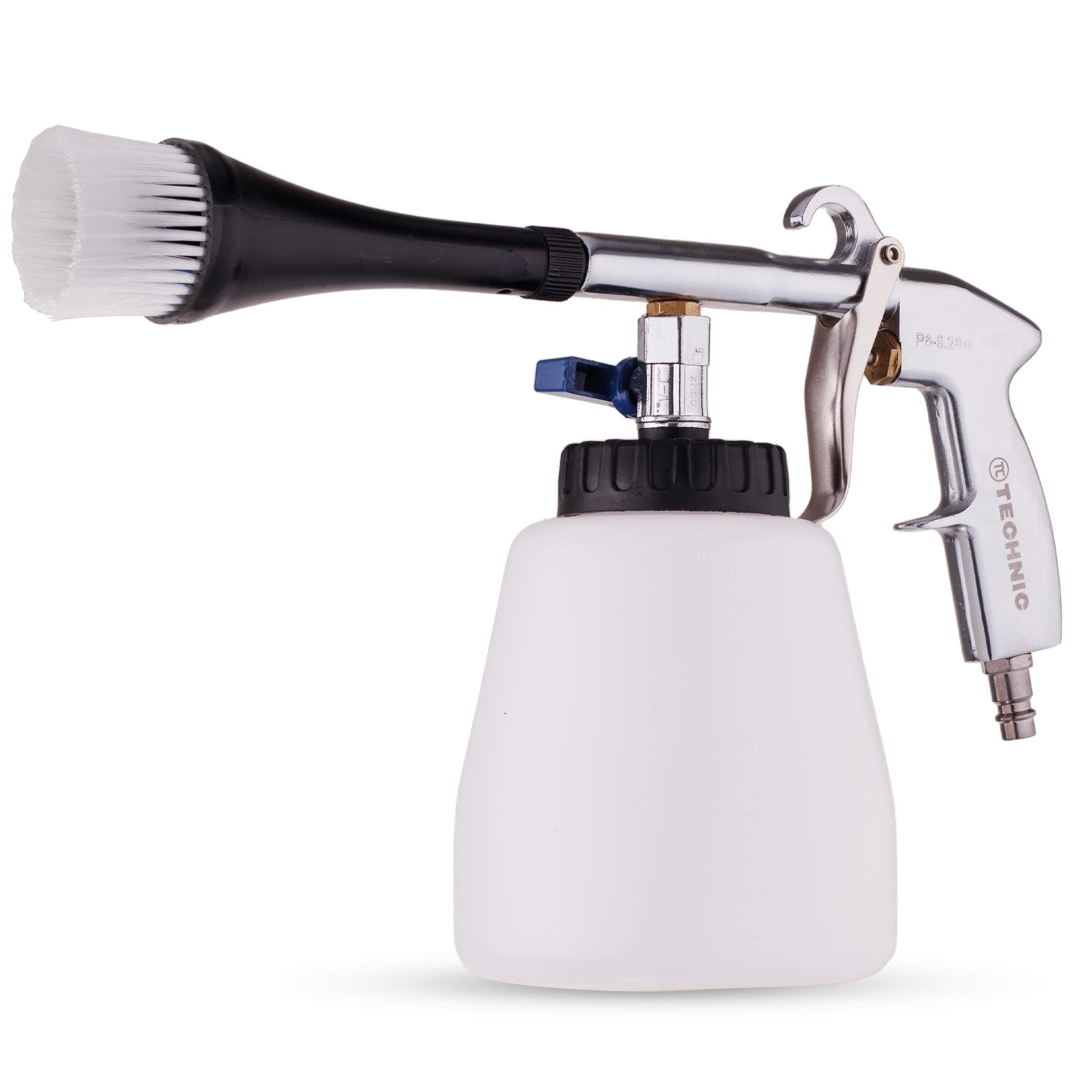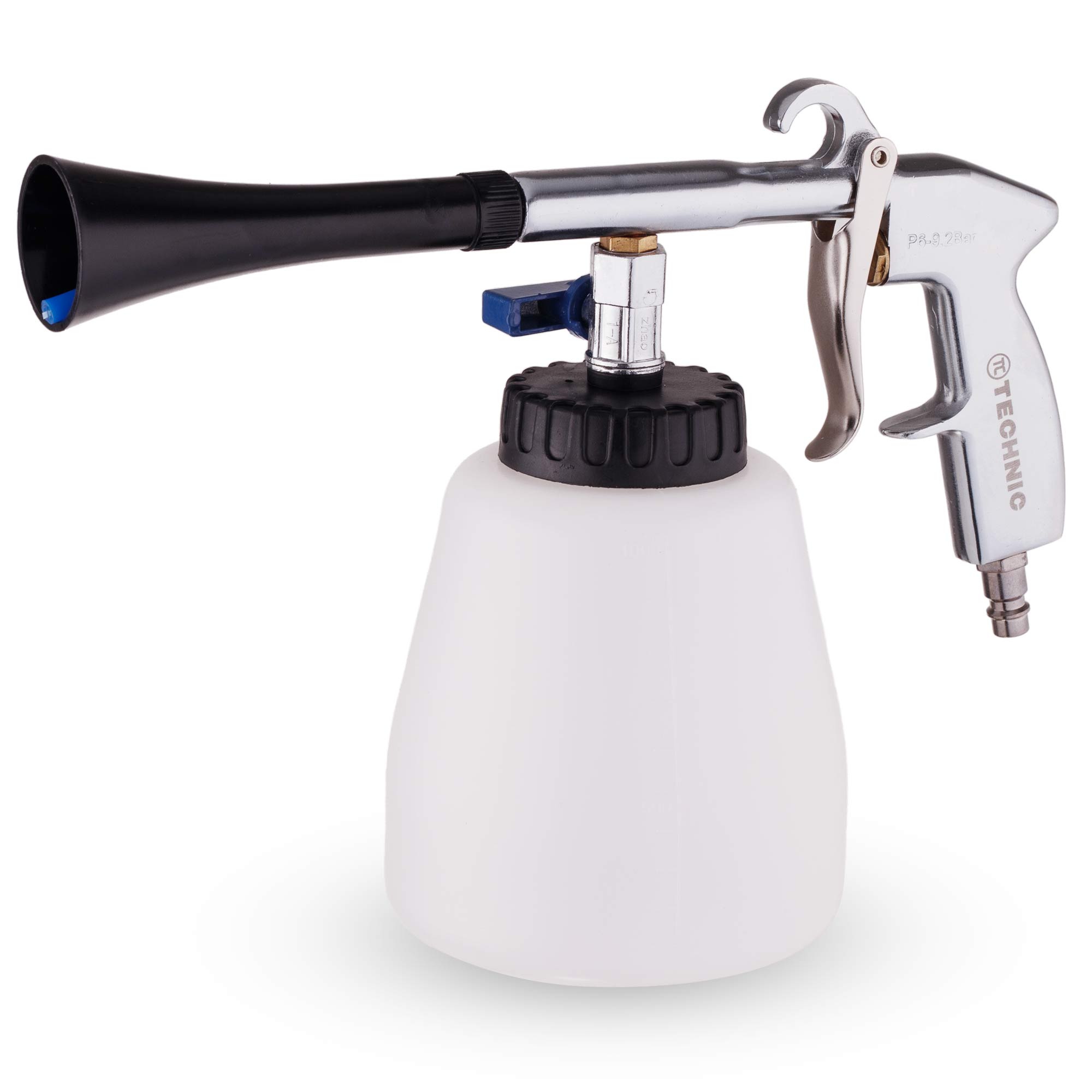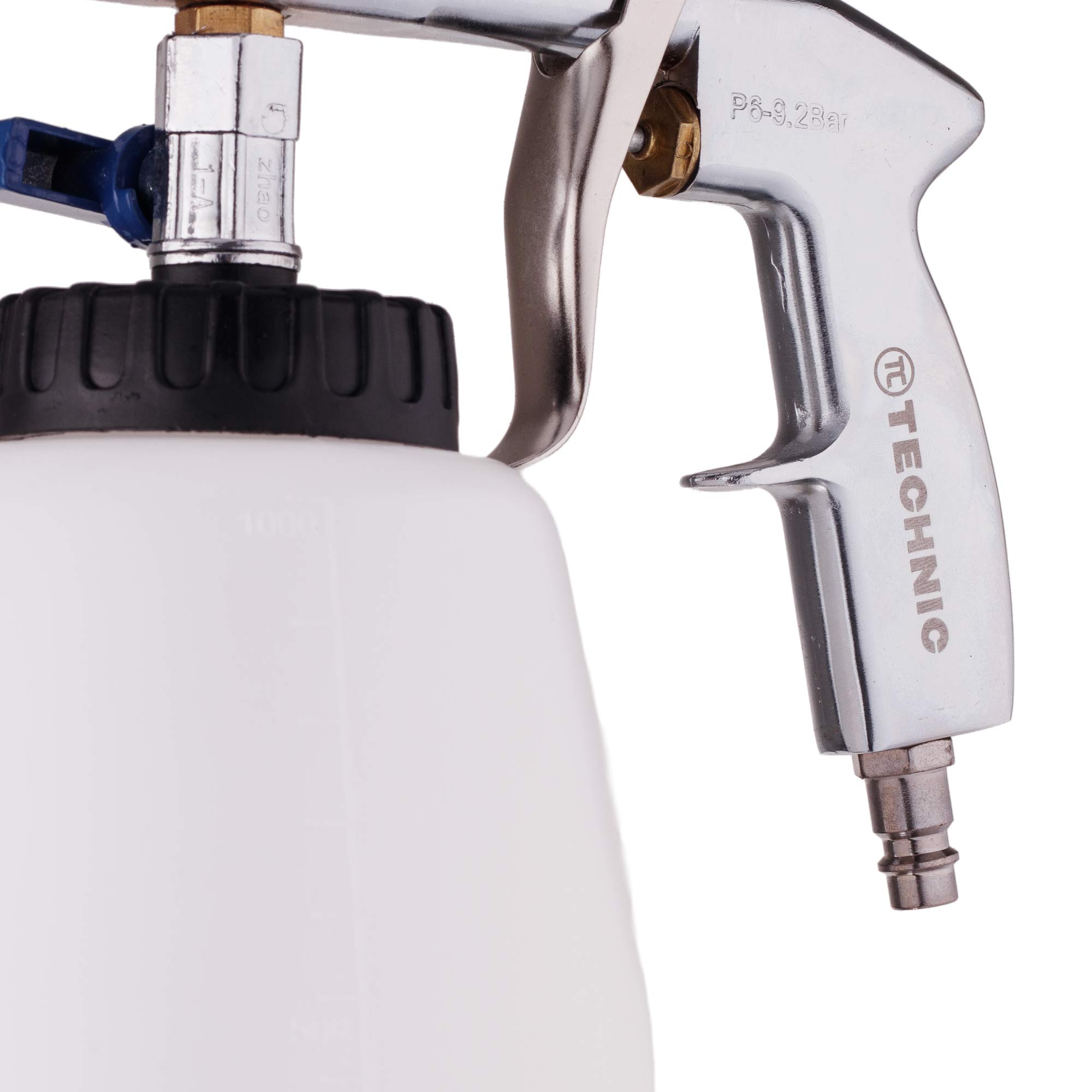 ZBIORNIK: jest duży i ukształtowany tak, aby można było z łatwością uzupełnić płyn, jak również postawić pistolet na zbiorniku. Dodatkowo posiada podziałkę co 100ml.