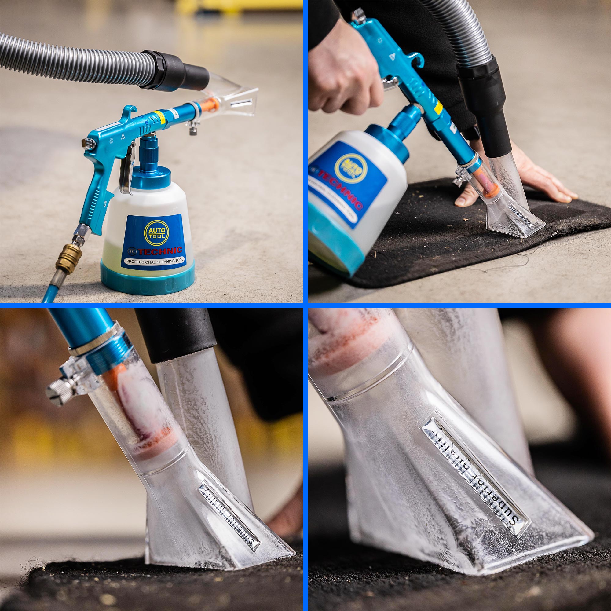 Die Pistole ist ideal für die Nassreinigung aller Arten von Schmutz auf Polstern, Klimaanlagen, Kunststoffelementen, Spiegelelementen, Sitzen, Teppichen, Lüftungsschlitzen und anderen schwer zu entfernenden Verschmutzungen.