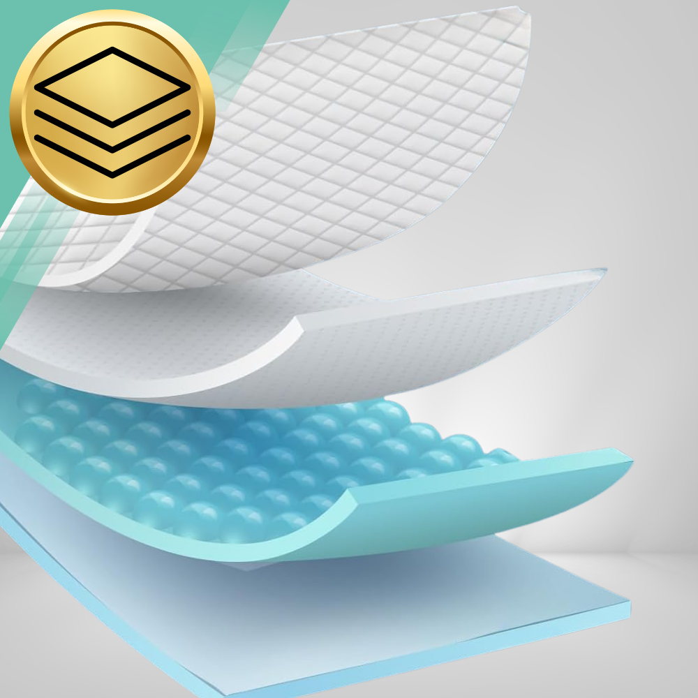 ◼ do 700 ml cieczy, co zapewnia suchość i higienę na długi czas. Specjalna 6 warstwowa budowa maty z wytłoczonym wzorem zwiększa chłonność, ponieważ ciecz jest rozprowadzana po całej powierzchni.