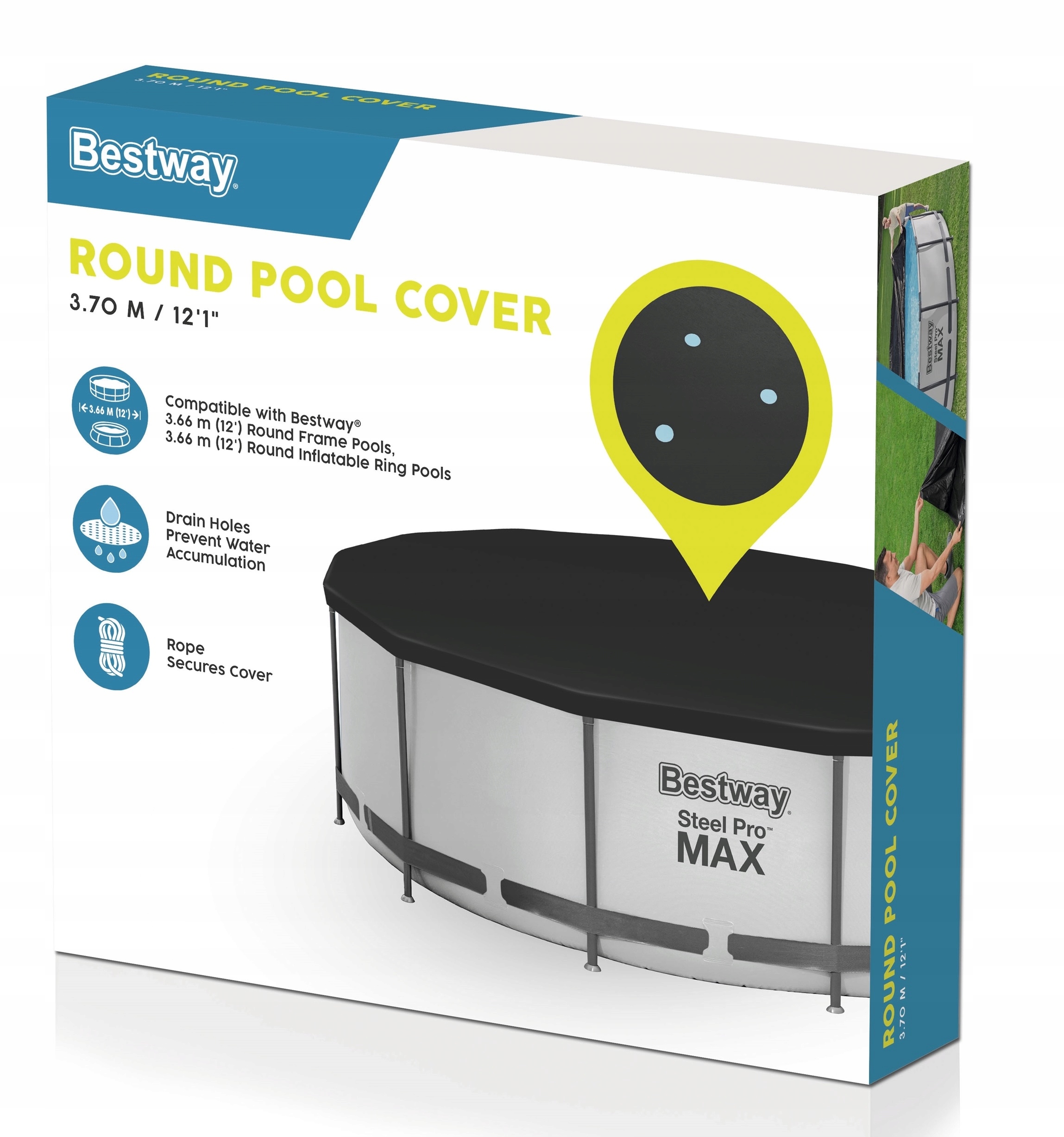 Pokrywa została zaprojektowana do modeli Bestway o średnicy 366 cm, ale może pasować również do innych basenów stelażowych o tej samej średnicy.