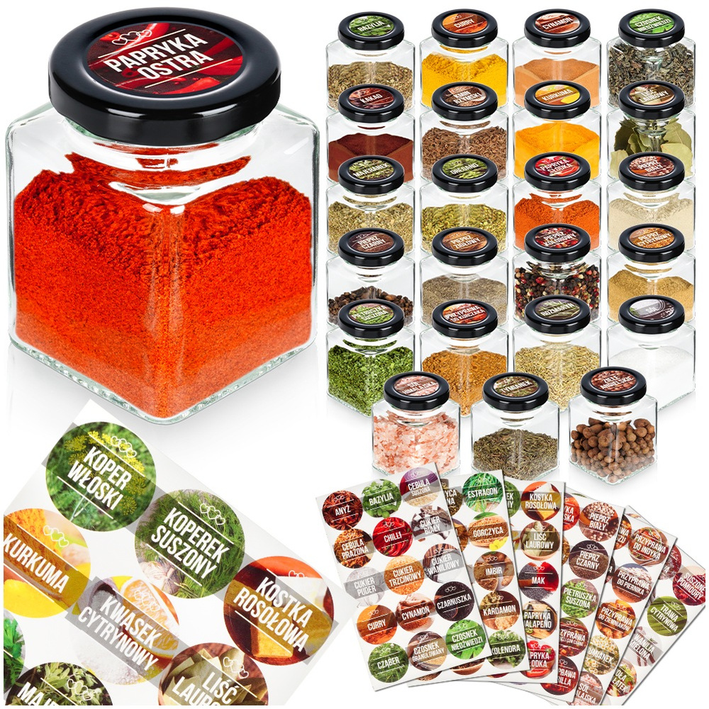 ✅ Pojemniki na przyprawy z naklejkami - Praktyczny zestaw składający się 24 słoiczków do przechowywania przypraw i ziół w zestawie z praktycznymi naklejkami. Zestaw zapewnia porządek i wygodę w codziennym gotowaniu. Każdy pojemnik ma kwadratowy…