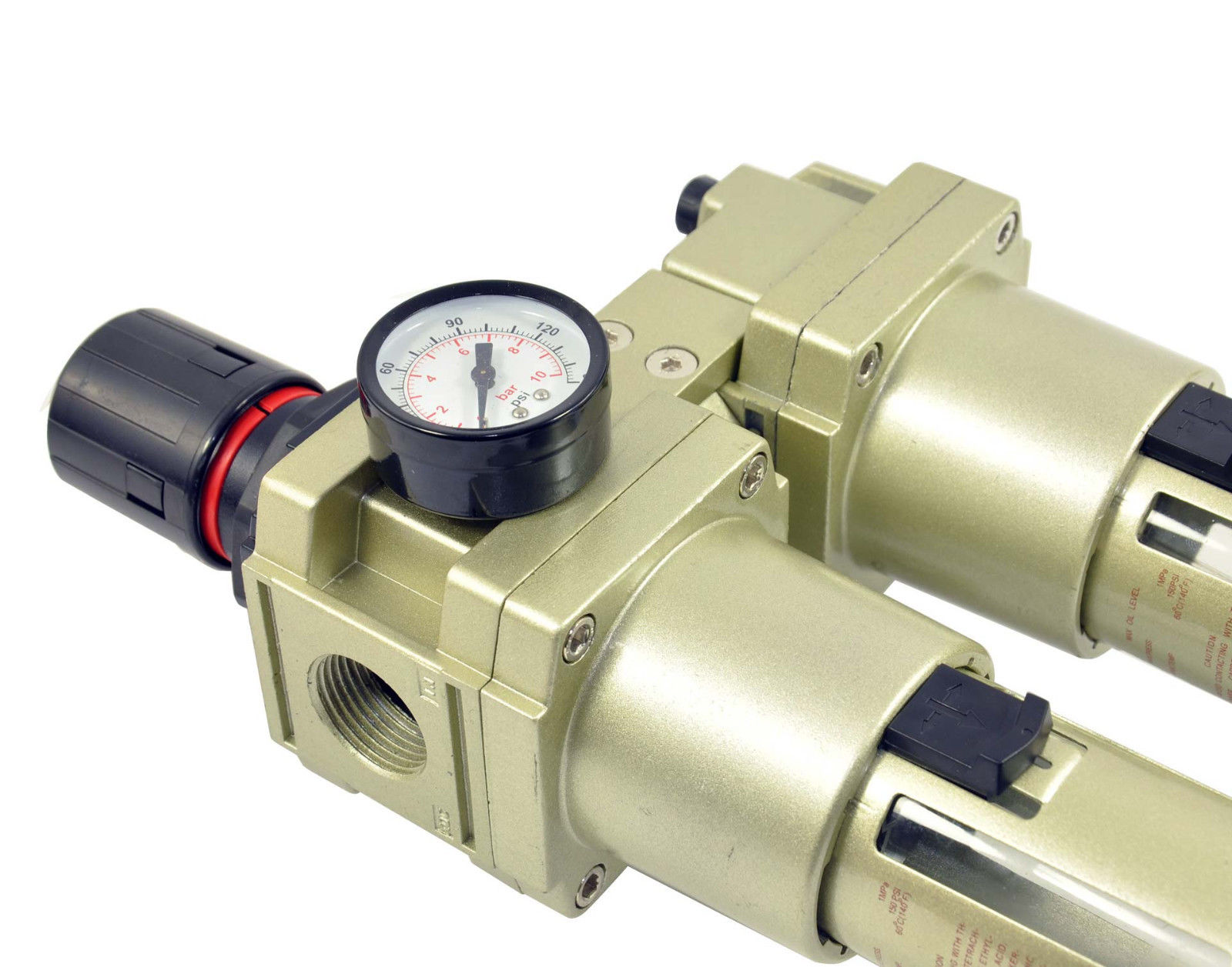 L'ensemble comprend un filtre à air (sécheur), un détendeur avec manomètre et un graisseur automatique.