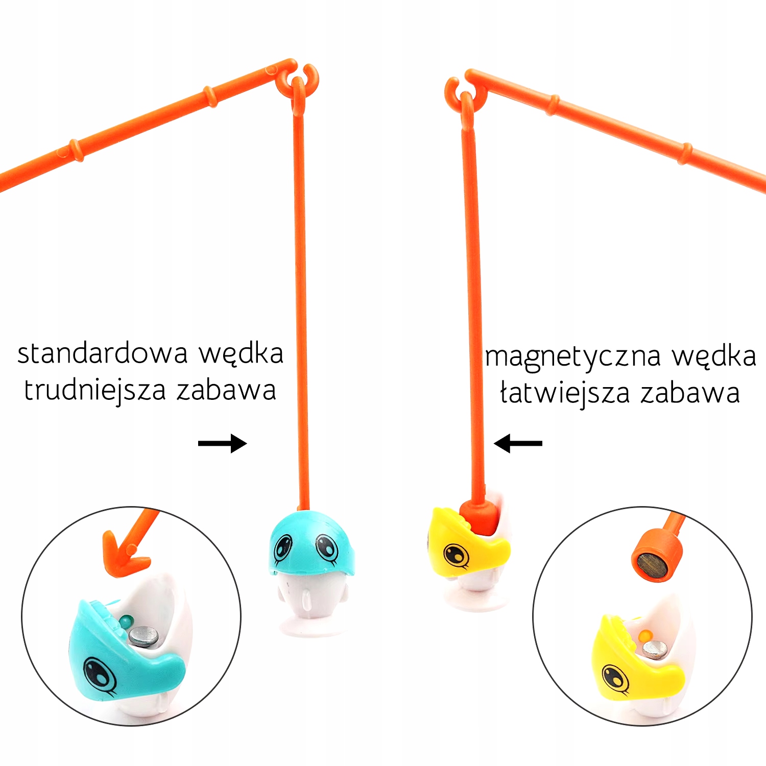 Zestaw posiada 12 różnokolorowych, losowo wybranych rybek, które po otwarciu pyszczka ukazują okrągły magnes. Rybkę można złowić na dwa sposoby: magnetyczną wędką, do której przyczepi się magnes lub manualnie poprzez zahaczenie wędką o pyszczek. Druga opcja jest trudniejsza i wymaga skupienia i precyzji.